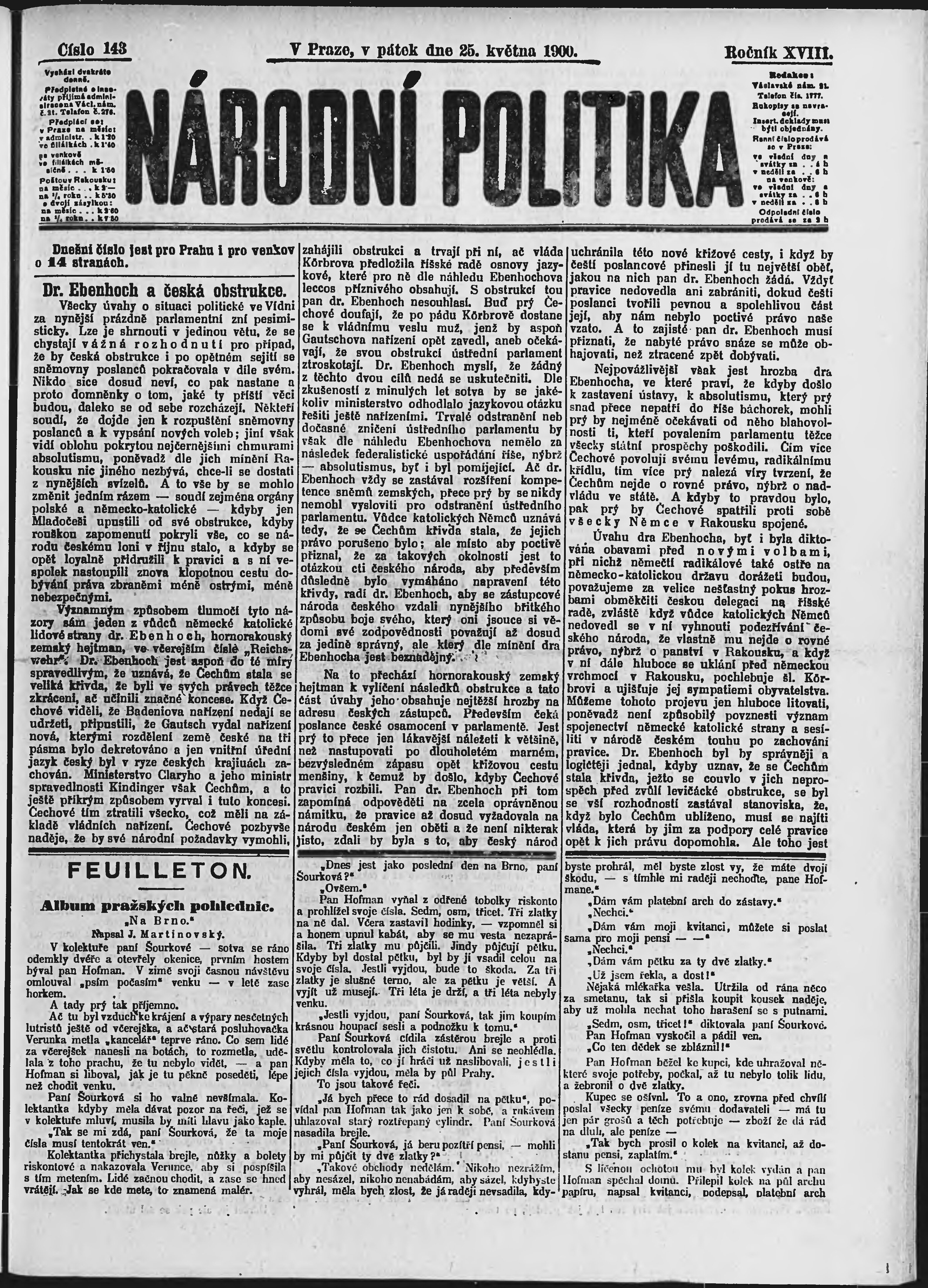 * Datum vydání výtisku: 25.5.1900 Číslo výtisku: 143 Poznámky k výtisku: ranní vydání;