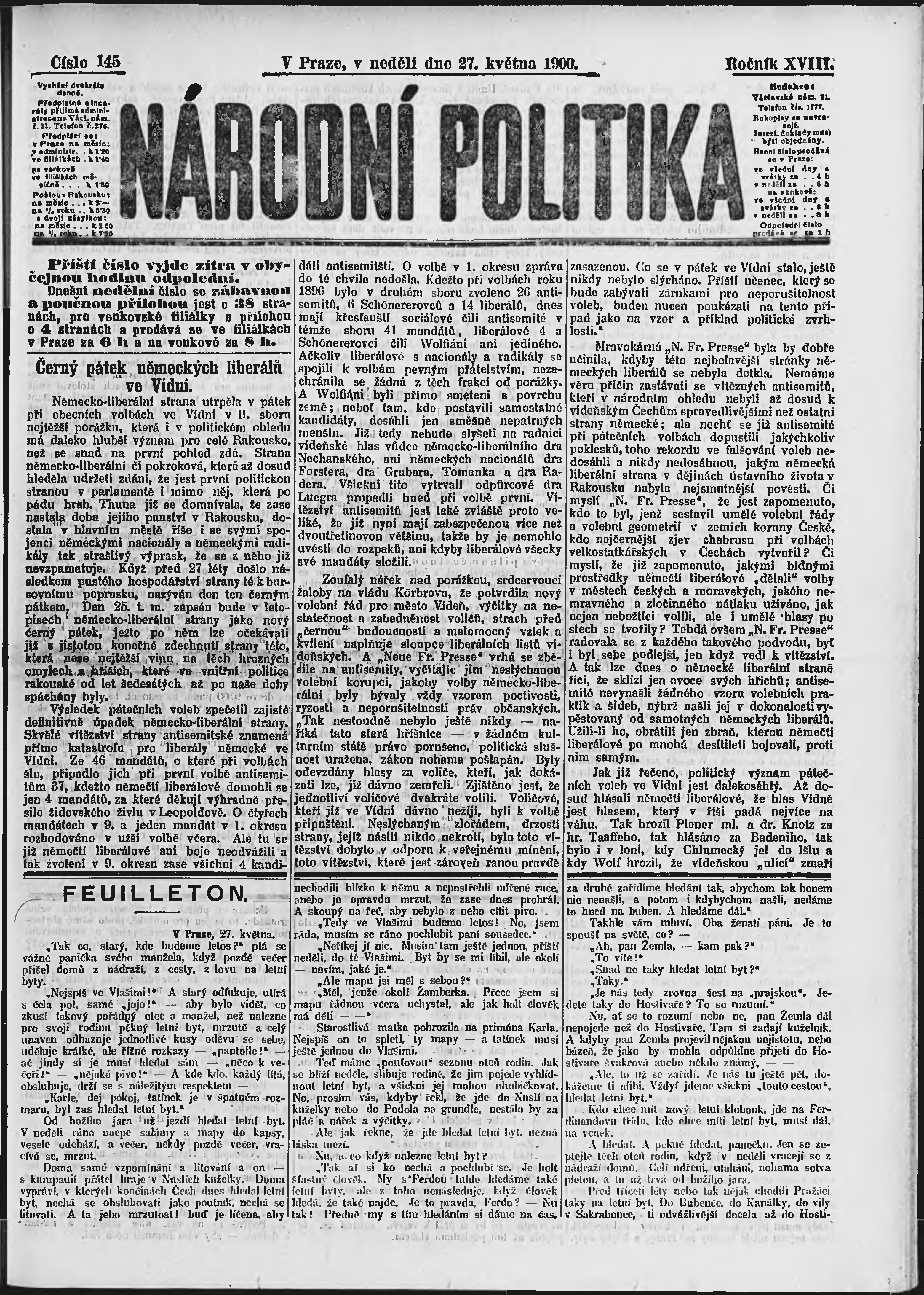 * Datum vydání výtisku: 27.5.1900 Číslo výtisku: 145 Poznámky k výtisku: ranní vydání;