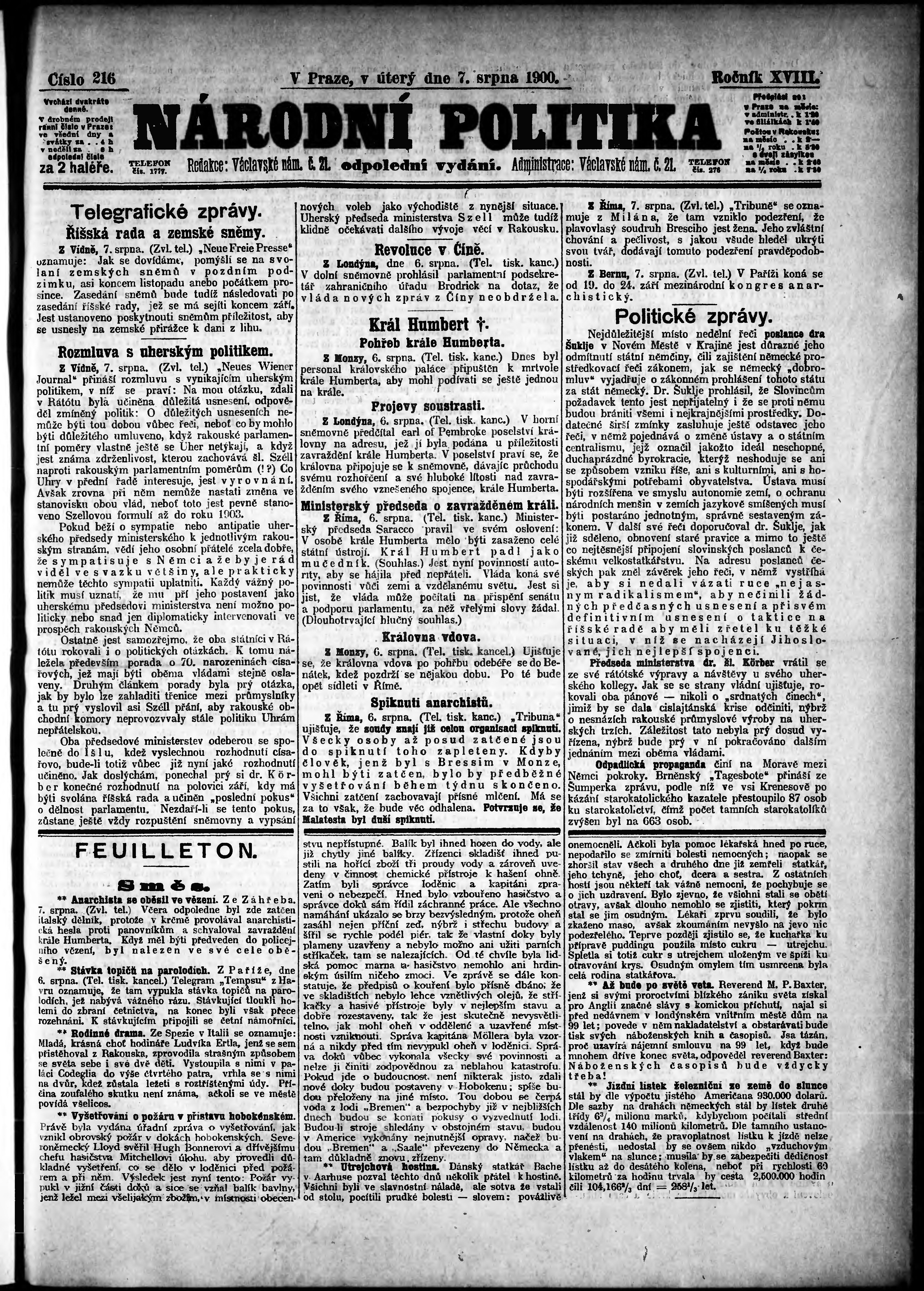 * Datum vydání výtisku: 7.8.1900 Číslo výtisku: 216 Poznámky k výtisku: odpolední vydání;