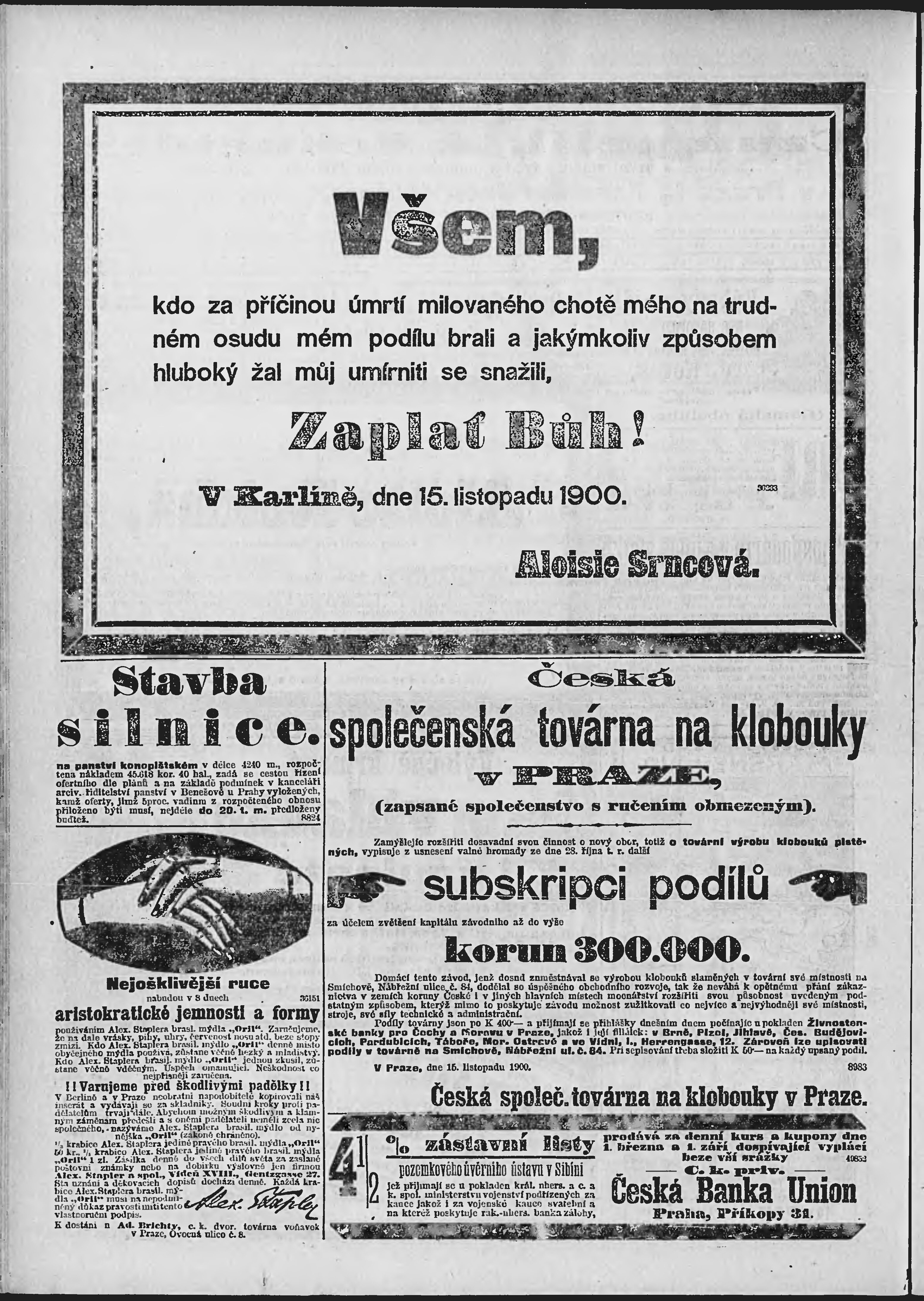 * Datum vydání výtisku: 15.11.1900 Číslo výtisku: 316 Poznámky k výtisku: ranní vydání;