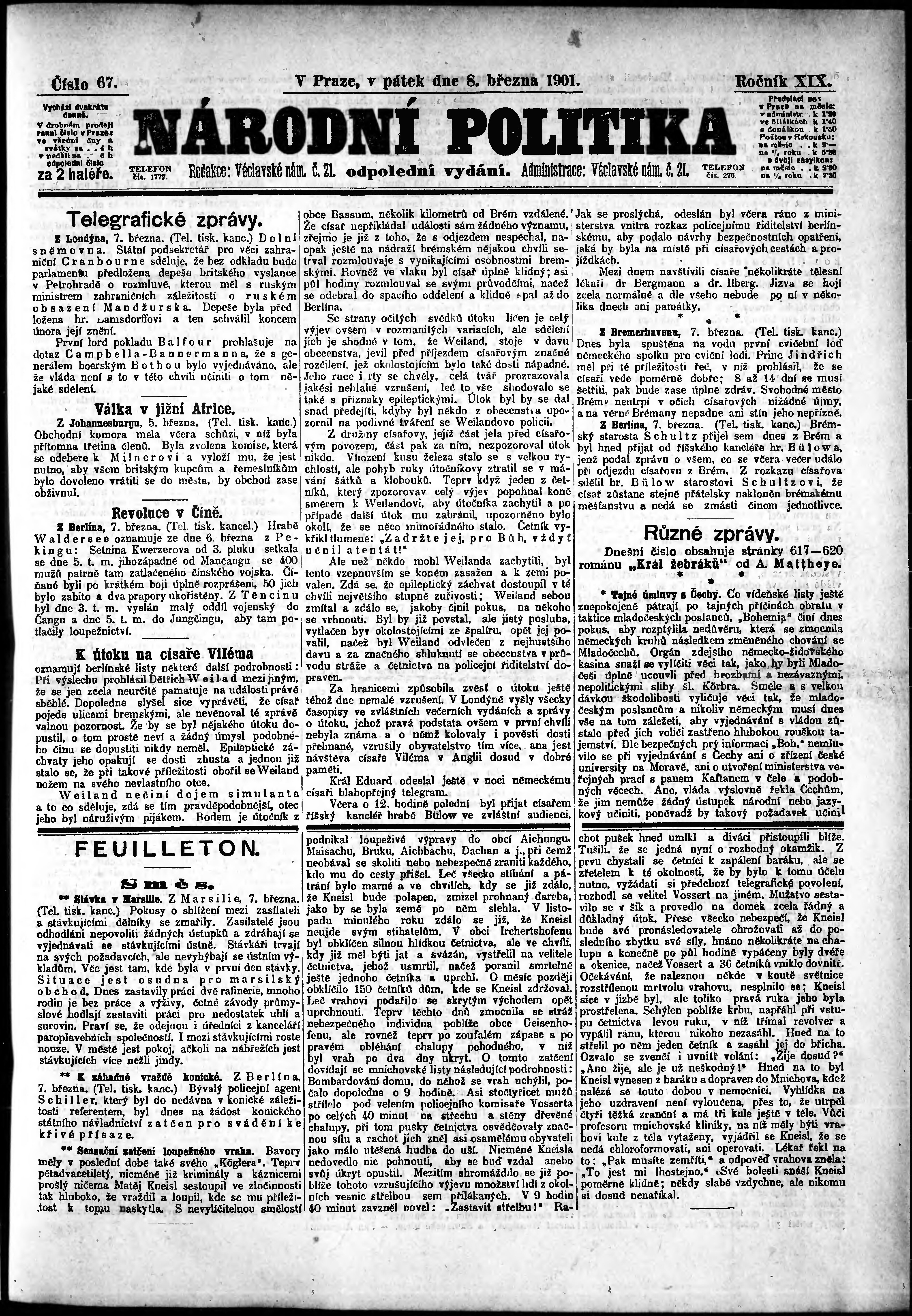 * Datum vydání výtisku: 8.3.1901 Číslo výtisku: 67 Poznámky k výtisku: odpolední vydání;