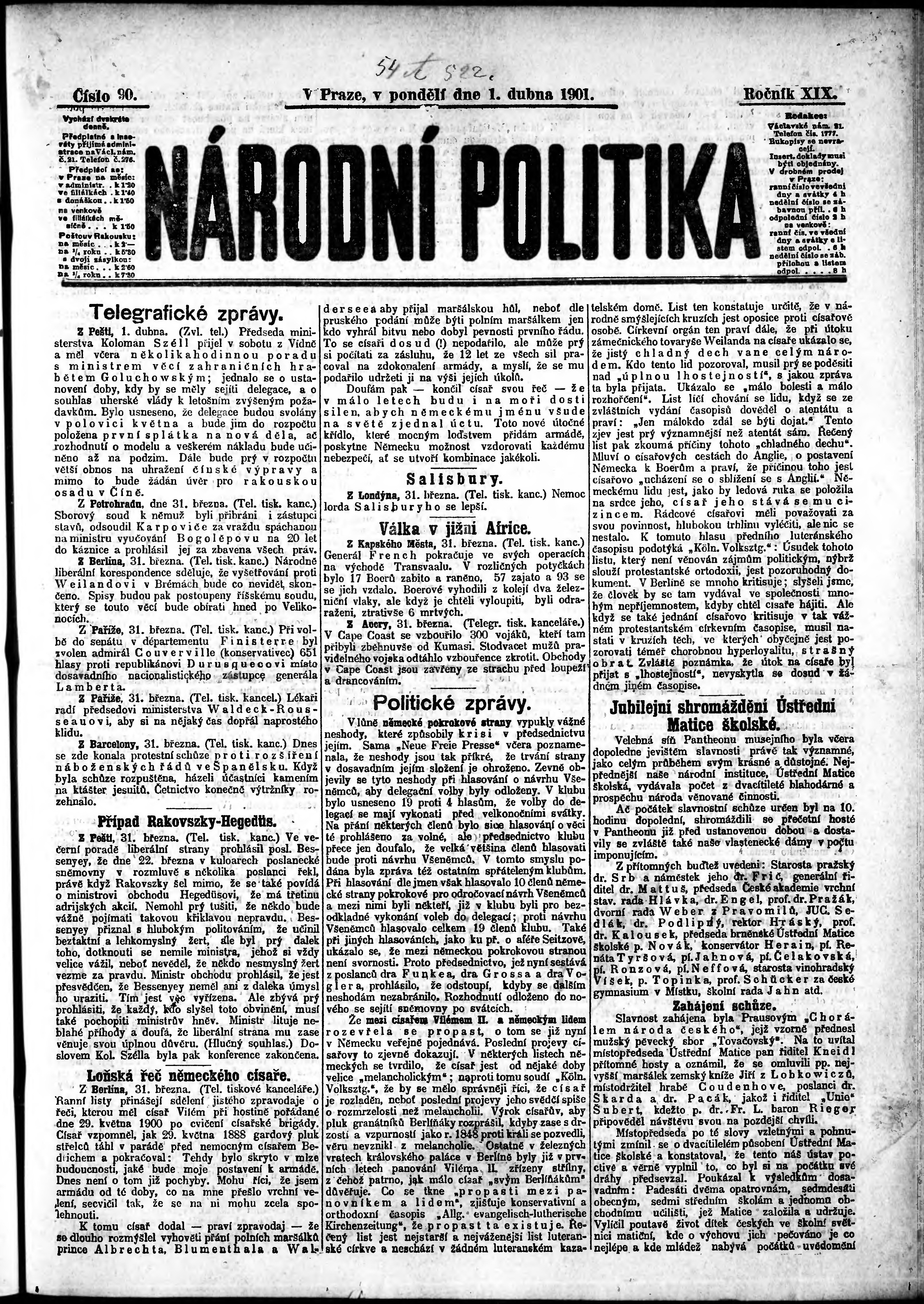 * Datum vydání výtisku: 1.4.1901 Číslo výtisku: 90 Poznámky k výtisku: ranní vydání;