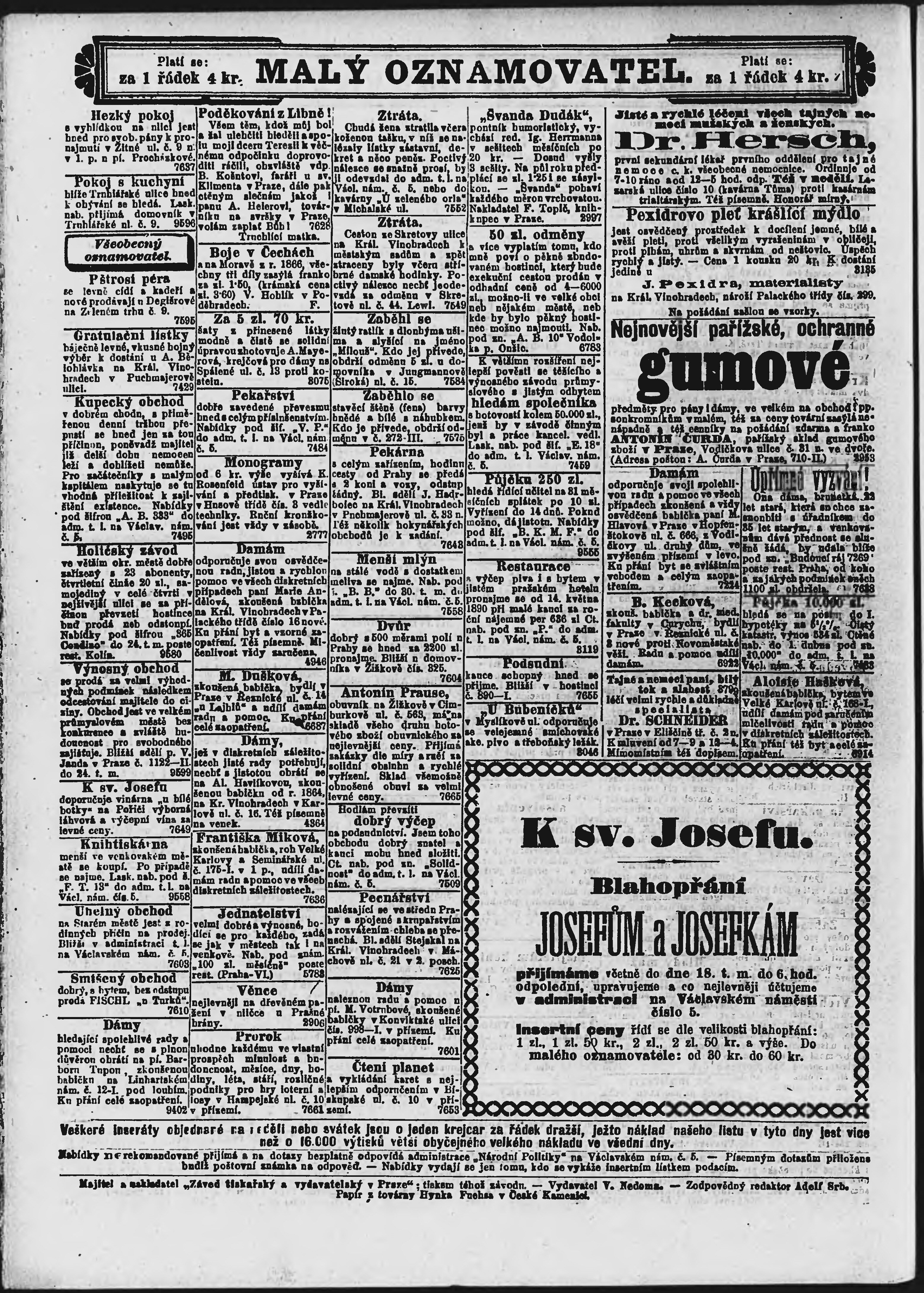 * Datum vydání výtisku: 15.3.1890 Číslo výtisku: 73 Poznámky k výtisku: ranní vydání;