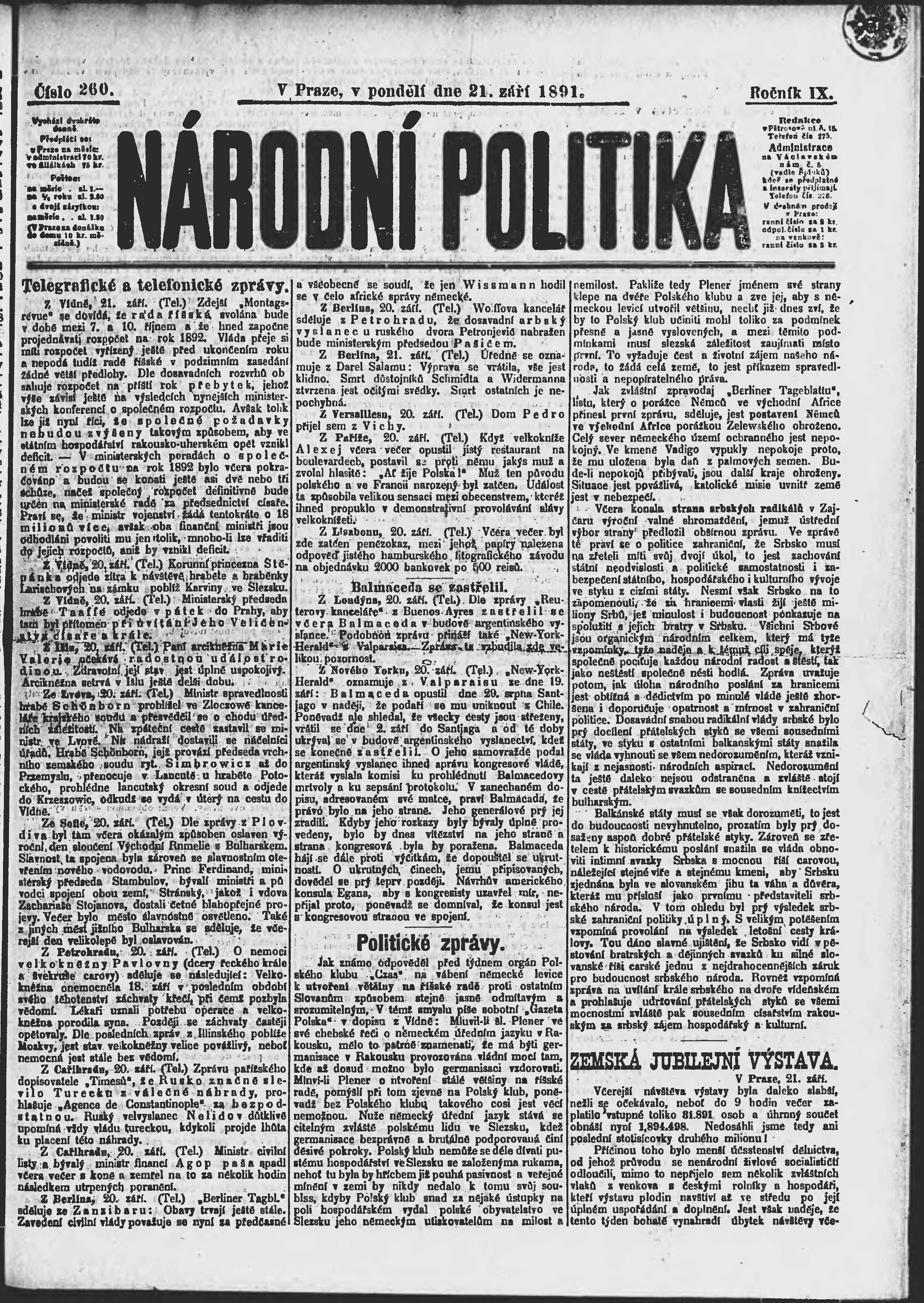 * Datum vydání výtisku: 21.9.1891 Číslo výtisku: 260 Poznámky k výtisku: ranní vydání;