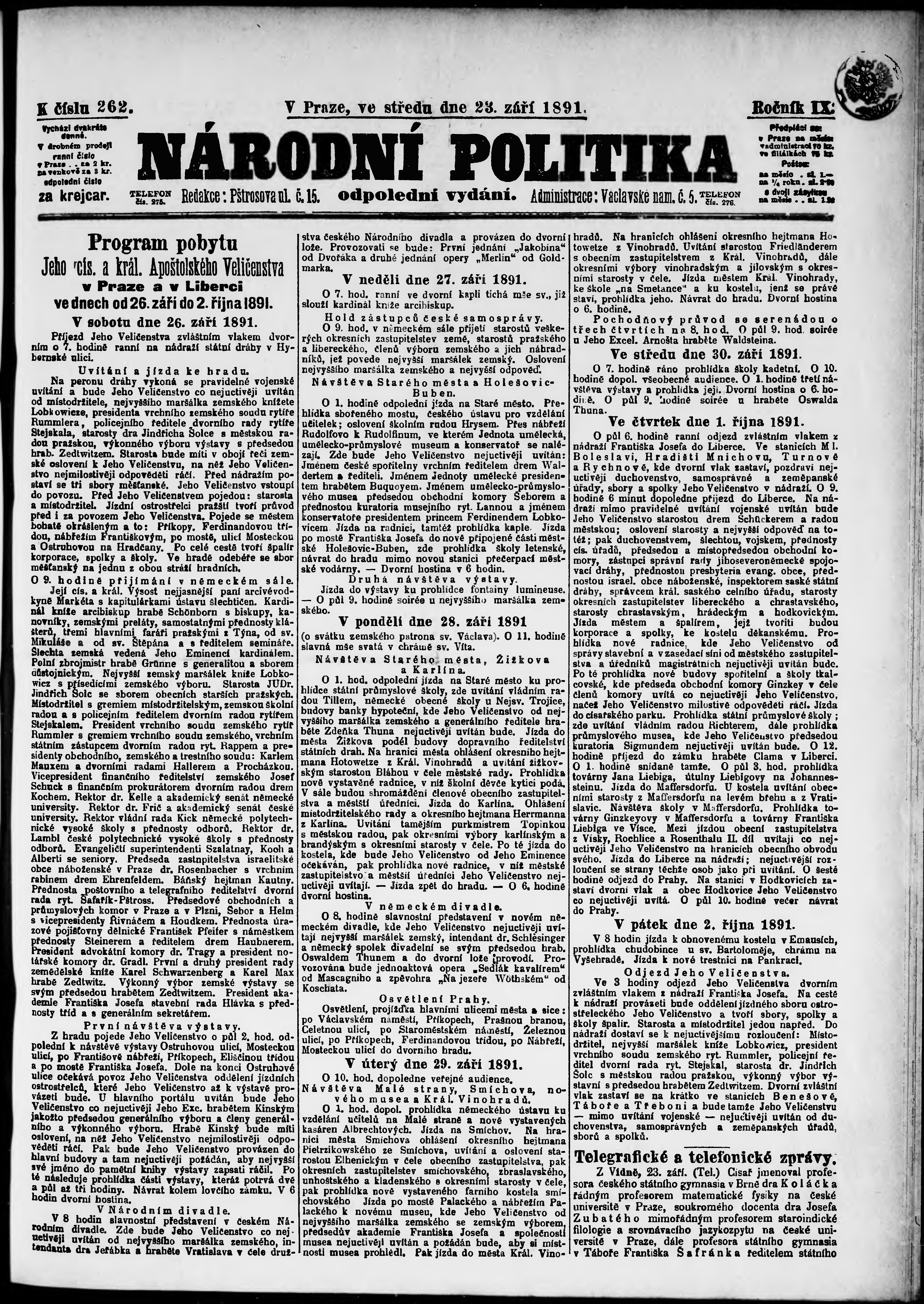 * Datum vydání výtisku: 23.9.1891 Číslo výtisku: 262 Poznámky k výtisku: odpolední vydání;