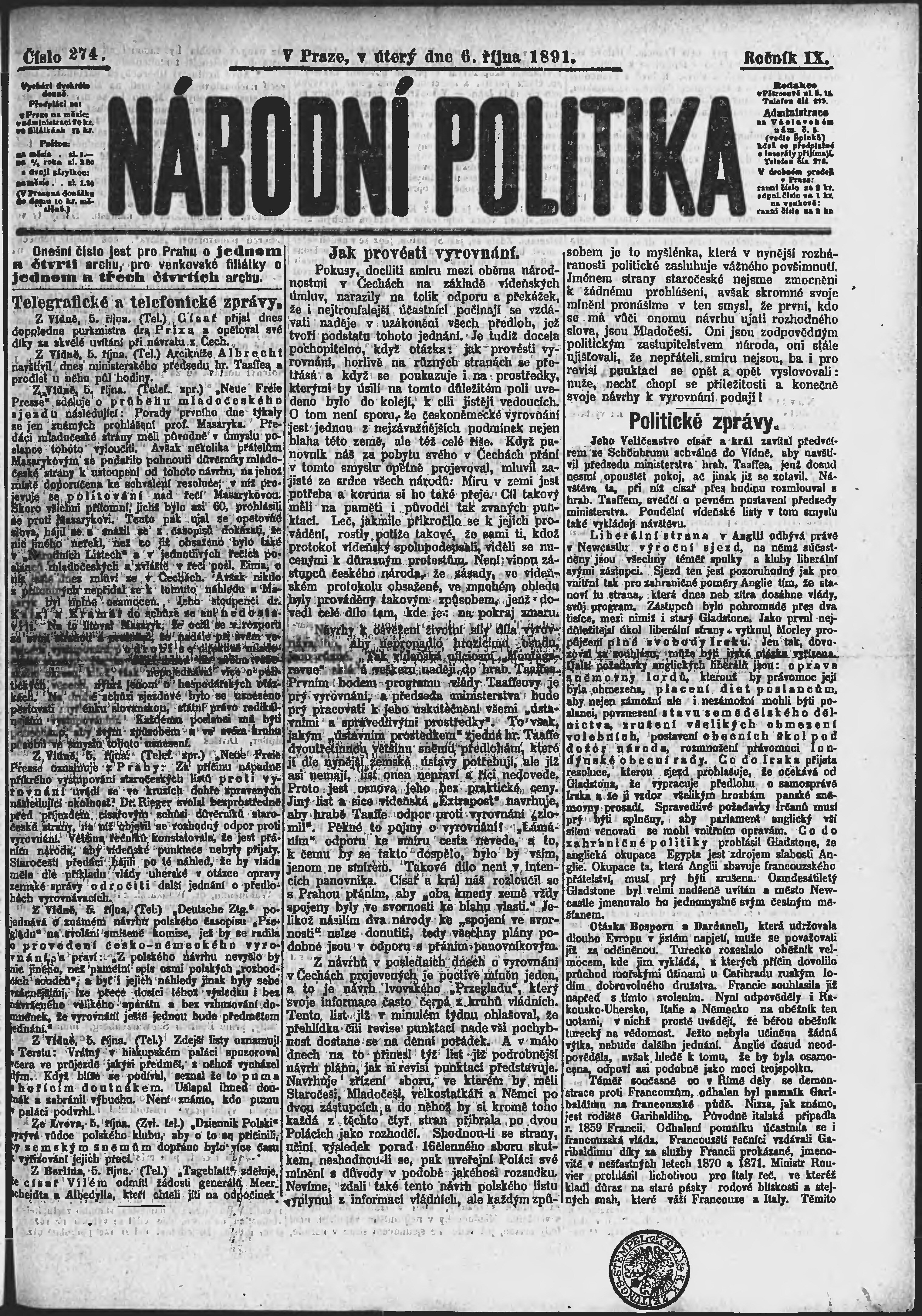 * Datum vydání výtisku: 6.10.1891 Číslo výtisku: 274 Poznámky k výtisku: ranní vydání;