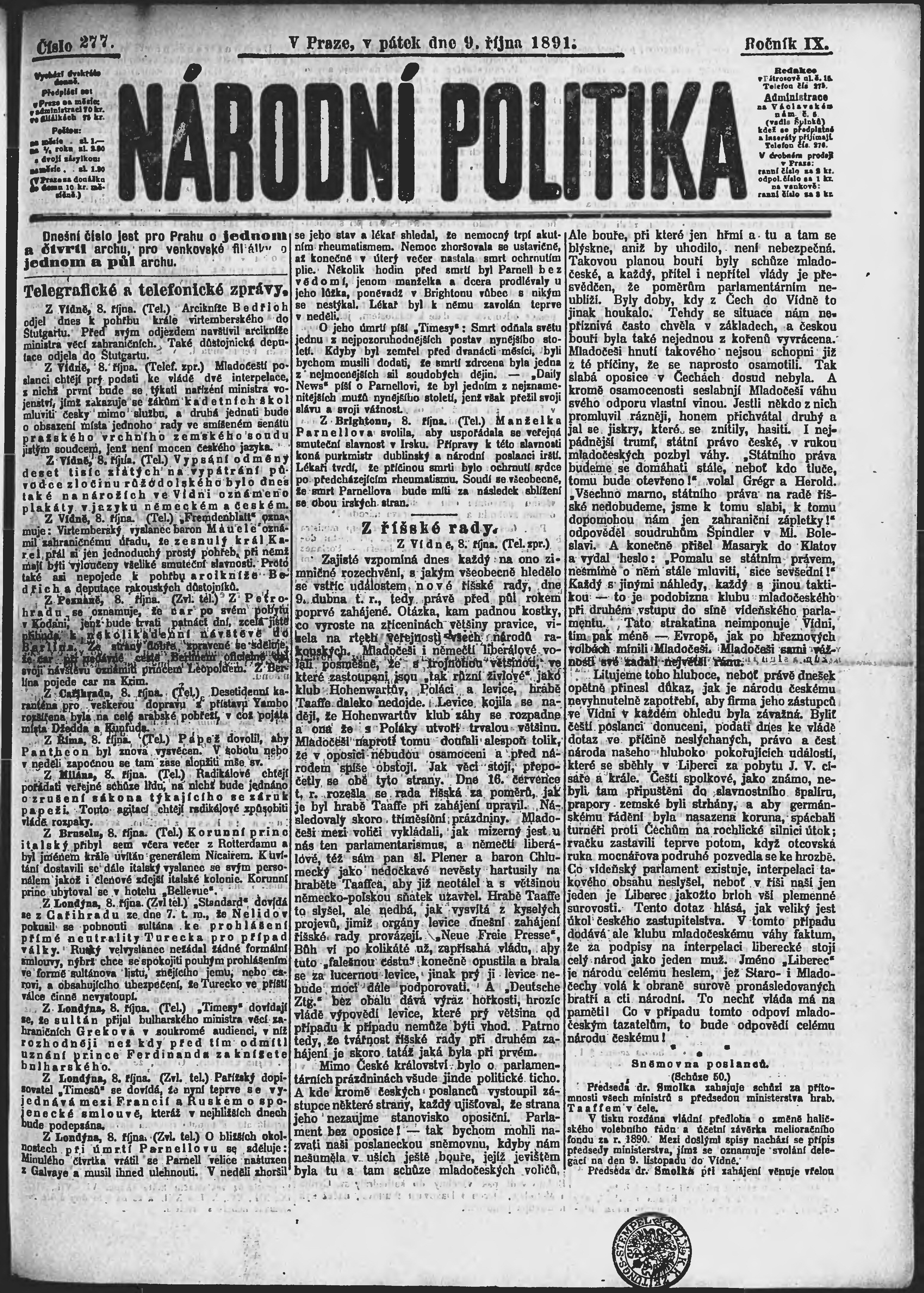 * Datum vydání výtisku: 9.10.1891 Číslo výtisku: 277 Poznámky k výtisku: ranní vydání;