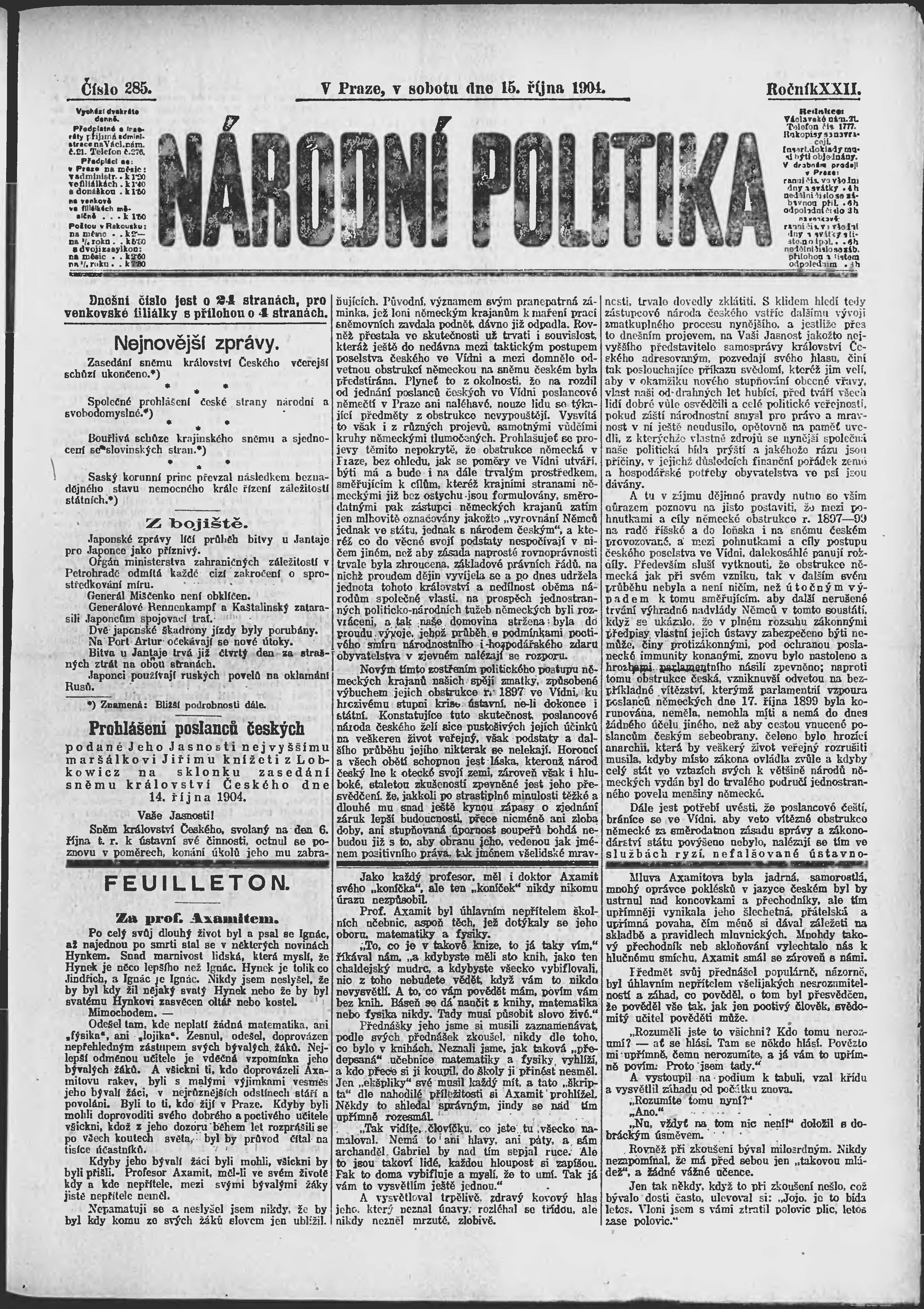 * Datum vydání výtisku: 15.10.1904 Číslo výtisku: 285 Poznámky k výtisku: ranní vydání;