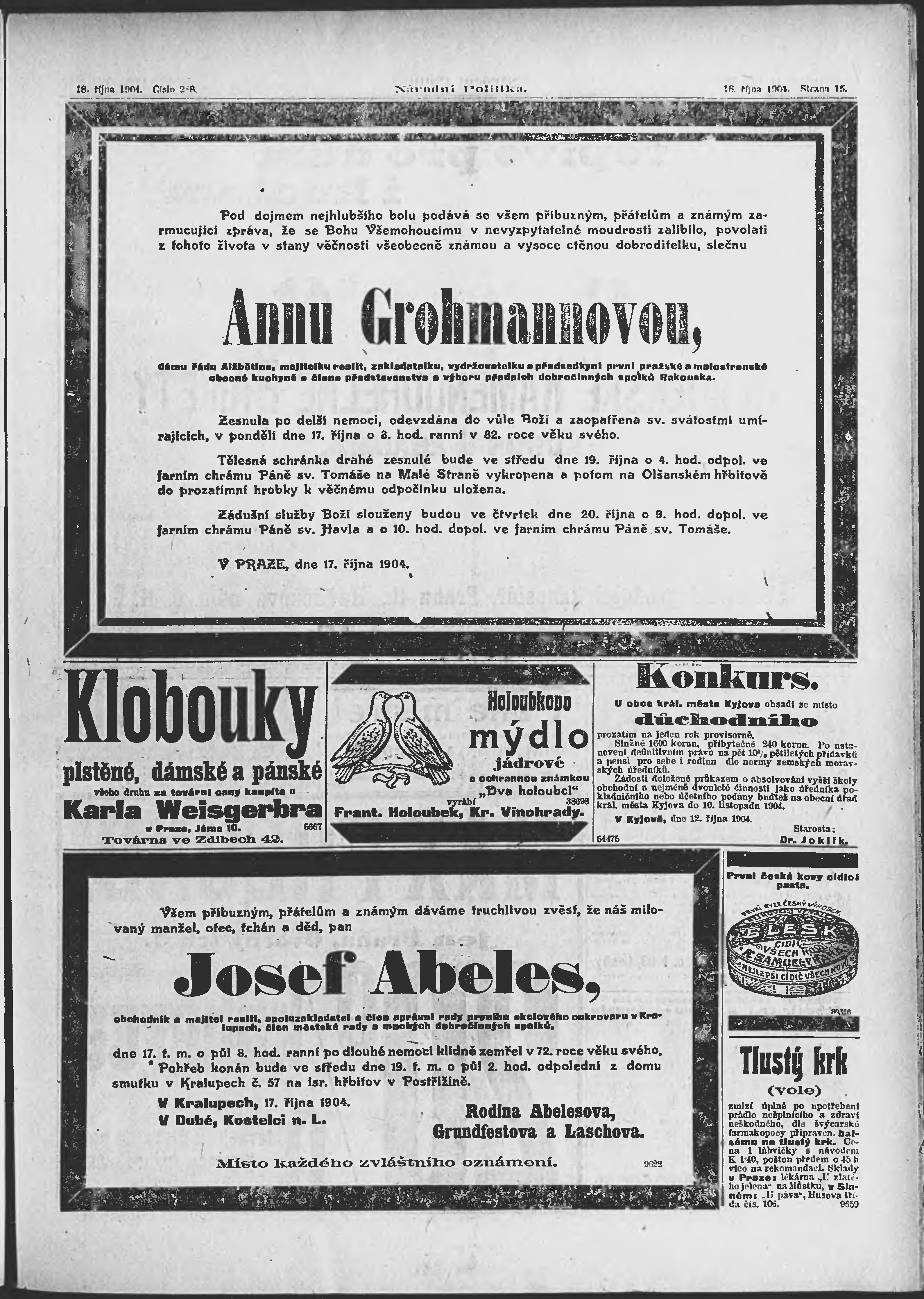 * Datum vydání výtisku: 18.10.1904 Číslo výtisku: 288 Poznámky k výtisku: ranní vydání;