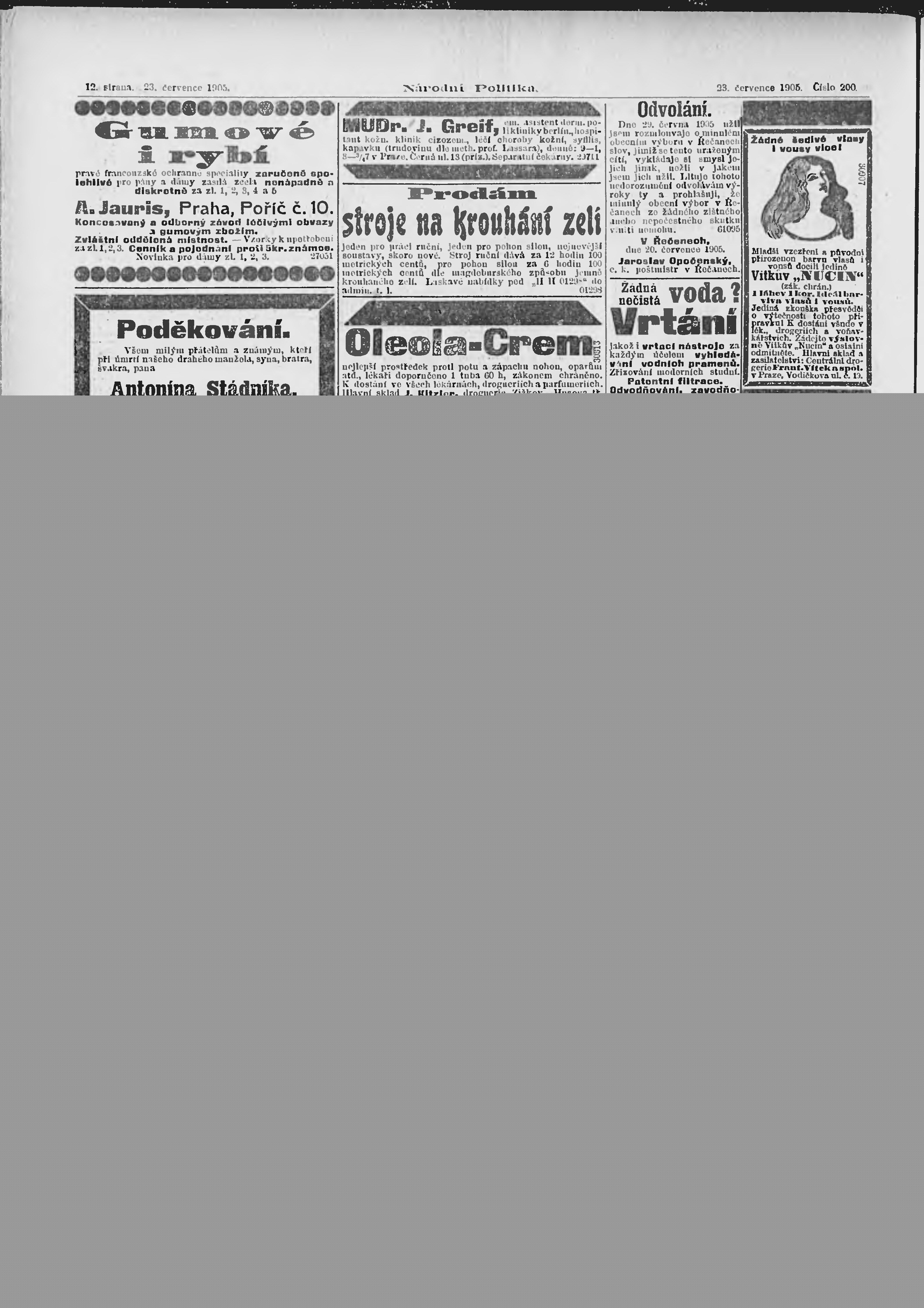 * Datum vydání výtisku: 23.7.1905 Číslo výtisku: 200 Poznámky k výtisku: ranní vydání;