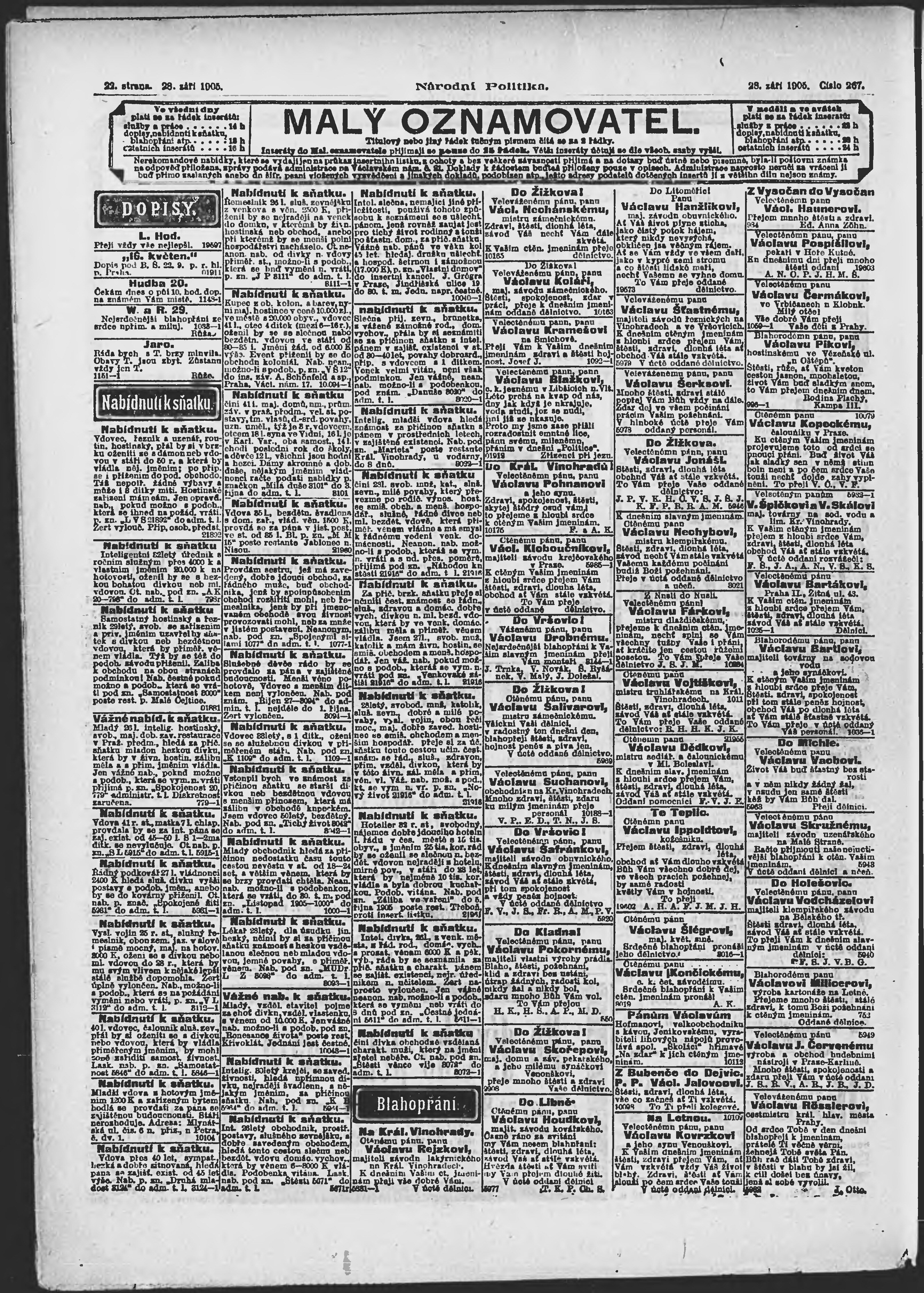 * Datum vydání výtisku: 28.9.1905 Číslo výtisku: 267 Poznámky k výtisku: ranní vydání;