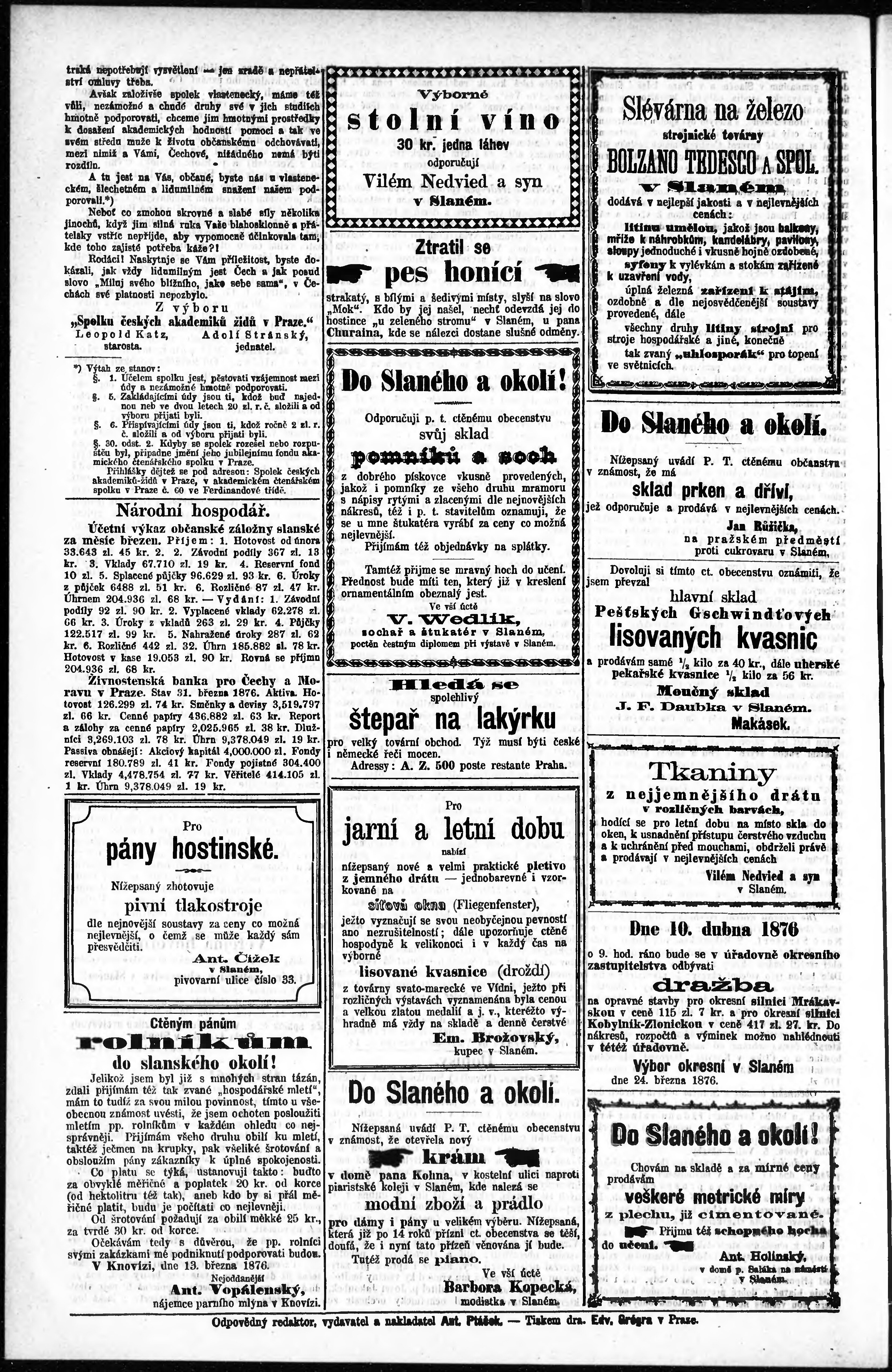 * Datum vydání výtisku: 8.4.1876 Číslo výtisku: 15