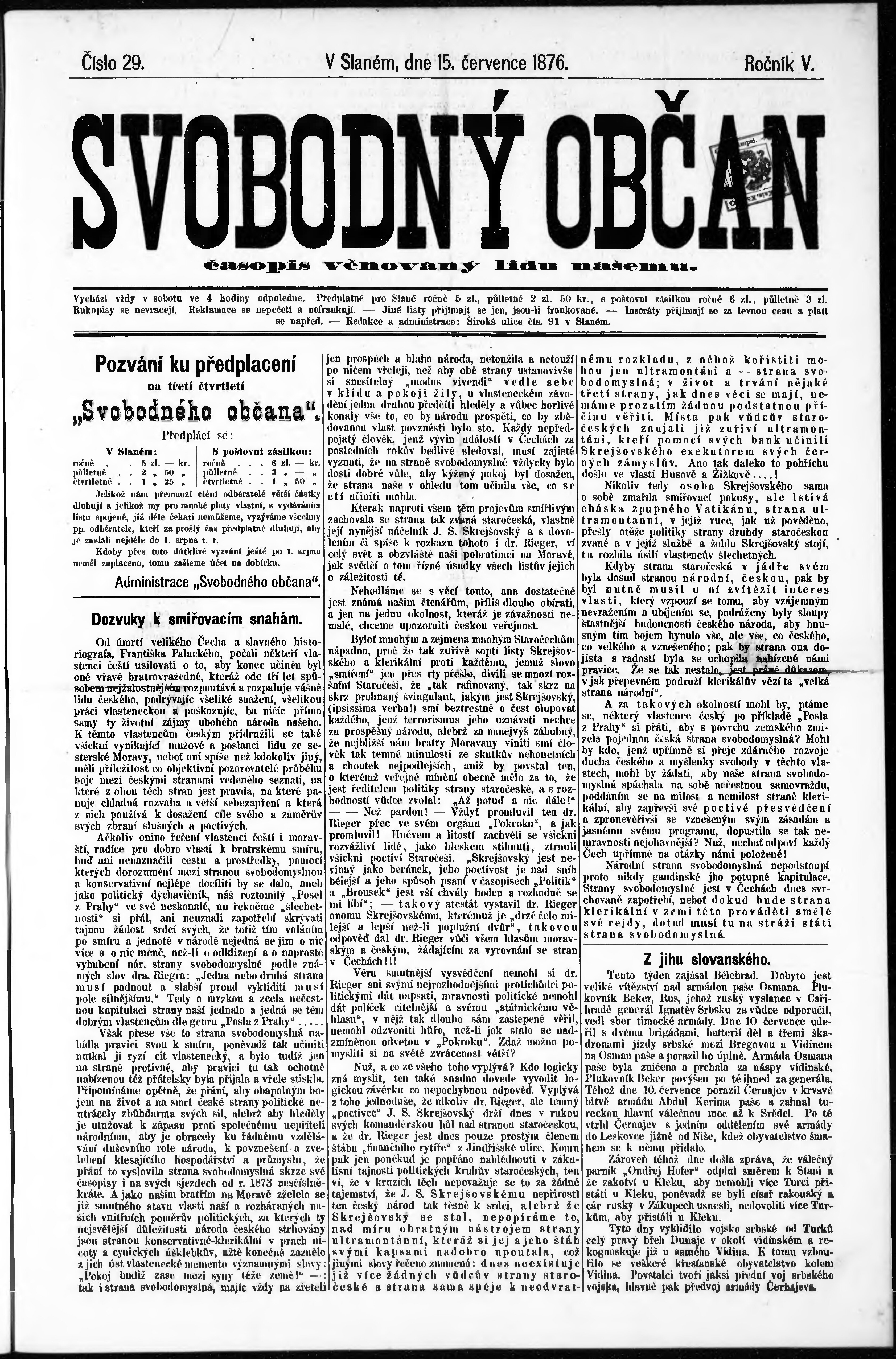 * Datum vydání výtisku: 15.7.1876 Číslo výtisku: 29