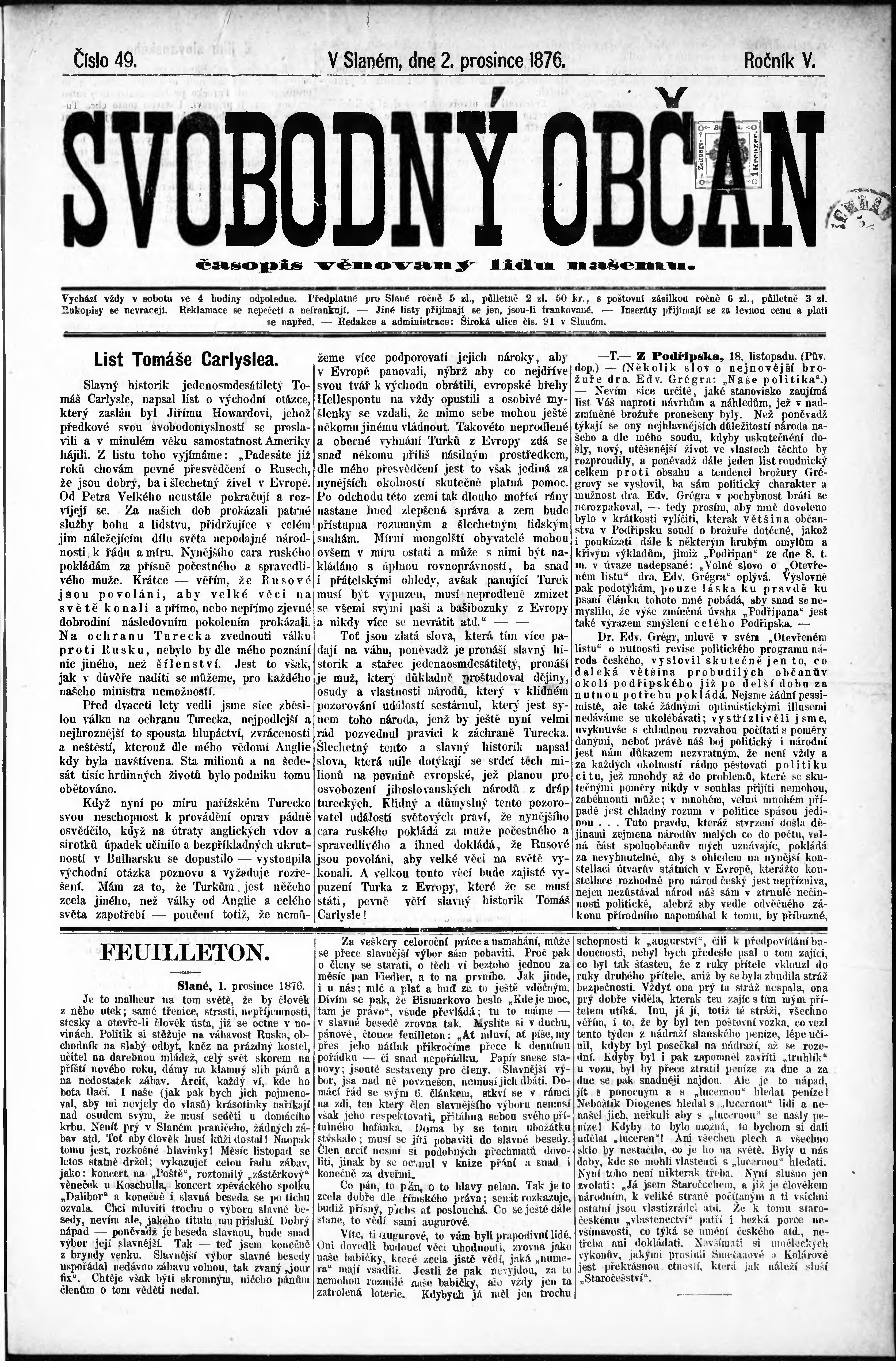 * Datum vydání výtisku: 2.12.1876 Číslo výtisku: 49