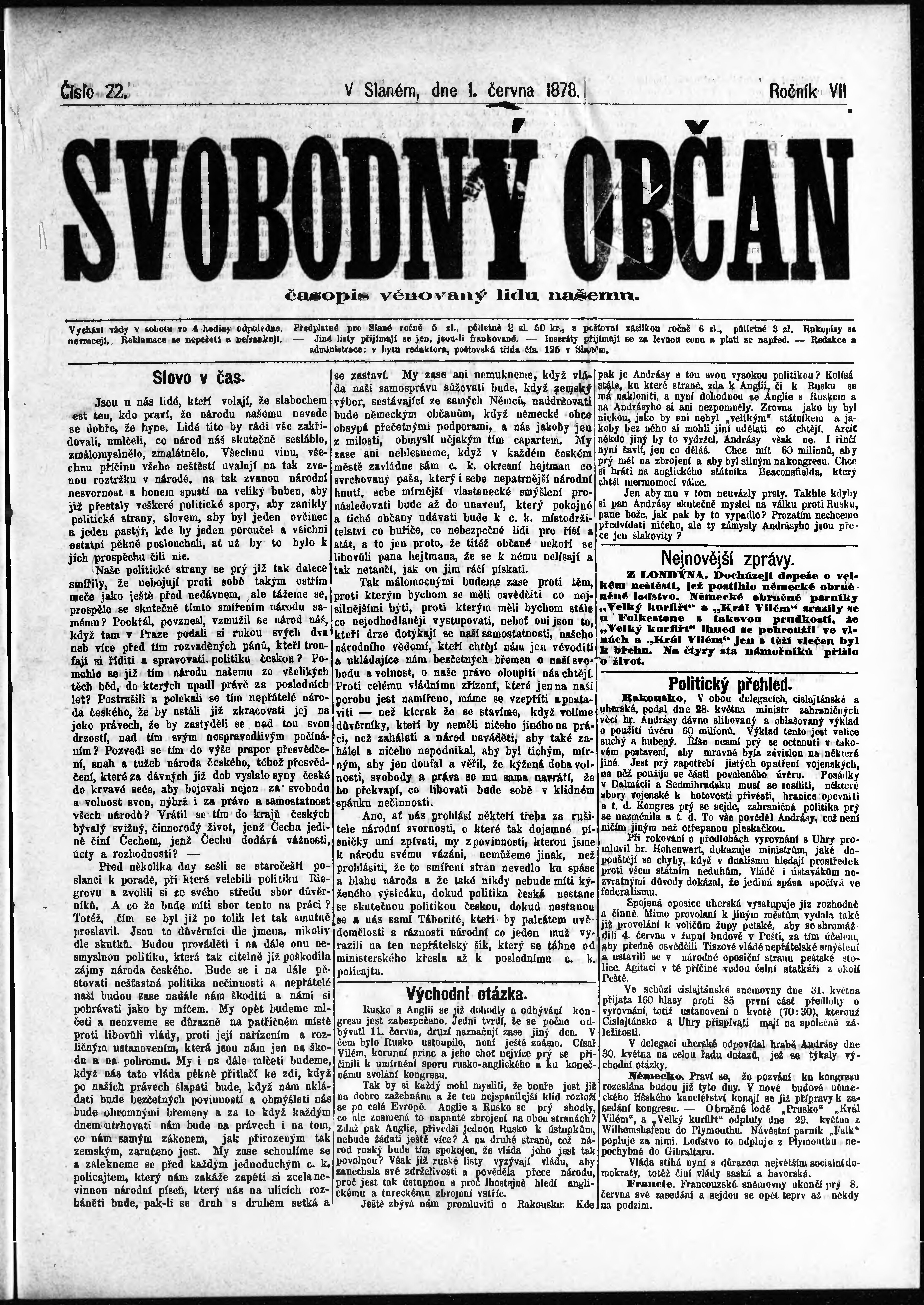 * Datum vydání výtisku: 1.6.1878 Číslo výtisku: 22
