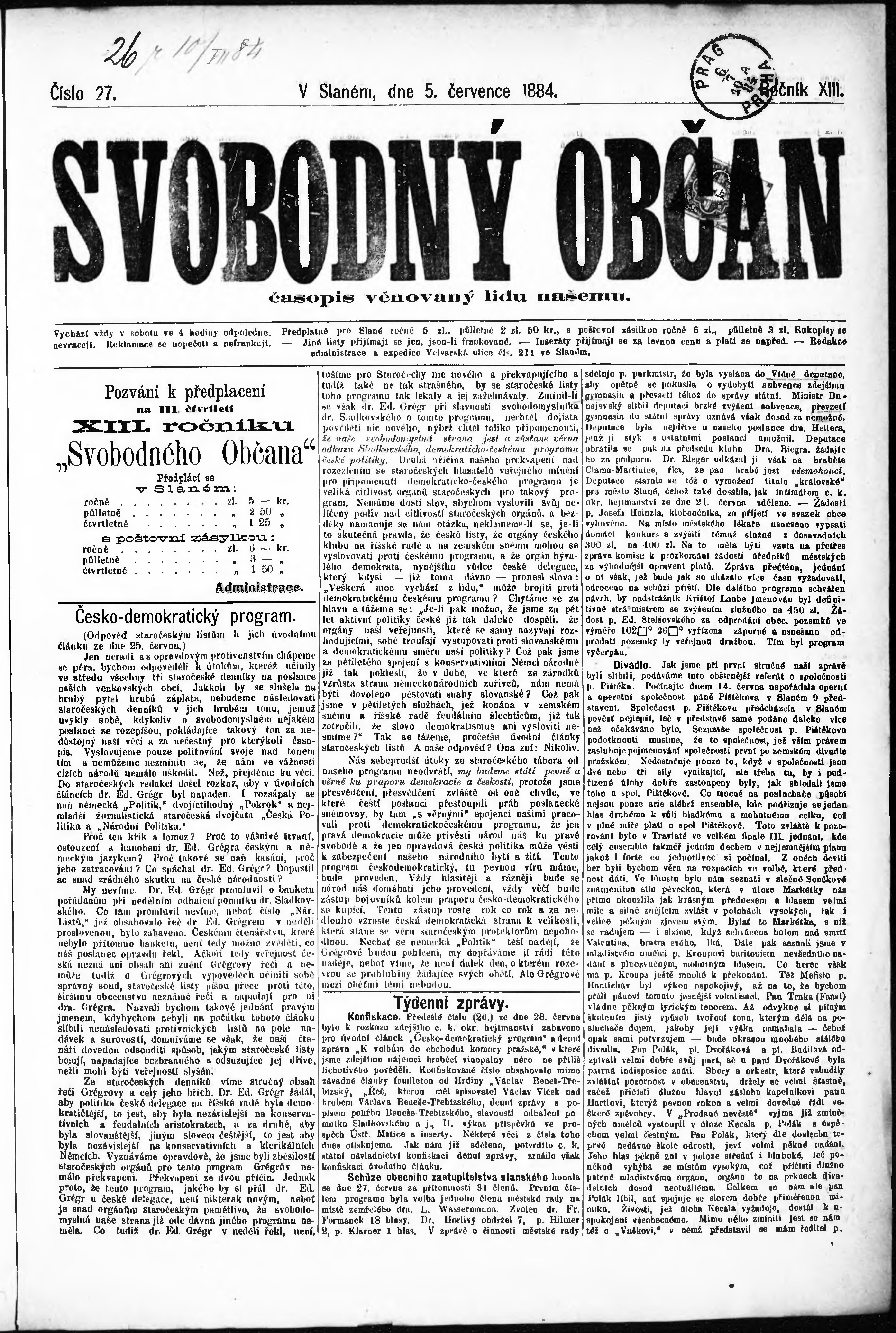 * Datum vydání výtisku: 5.7.1884 Číslo výtisku: 27