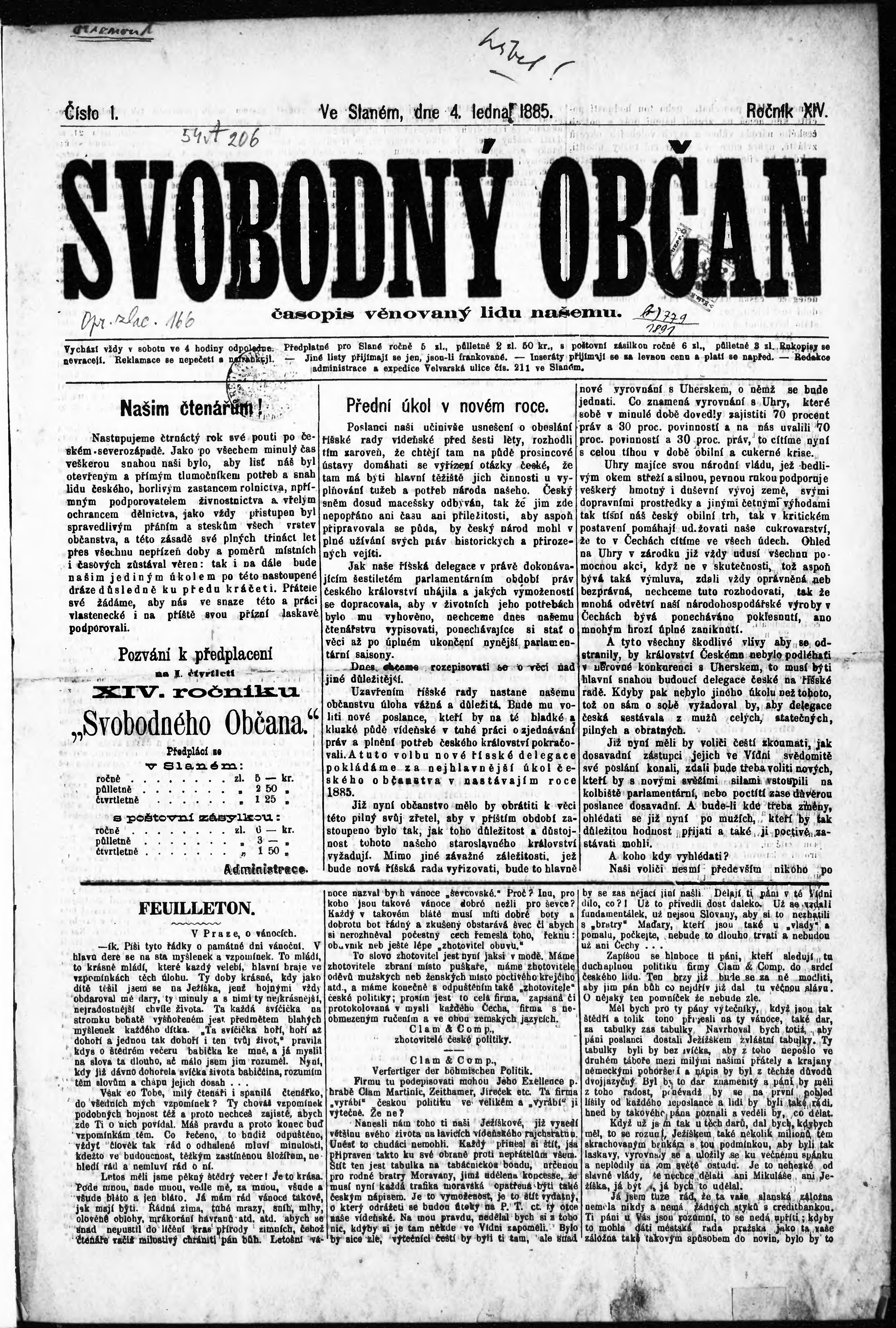 * Datum vydání výtisku: 4.1.1885 Číslo výtisku: 1