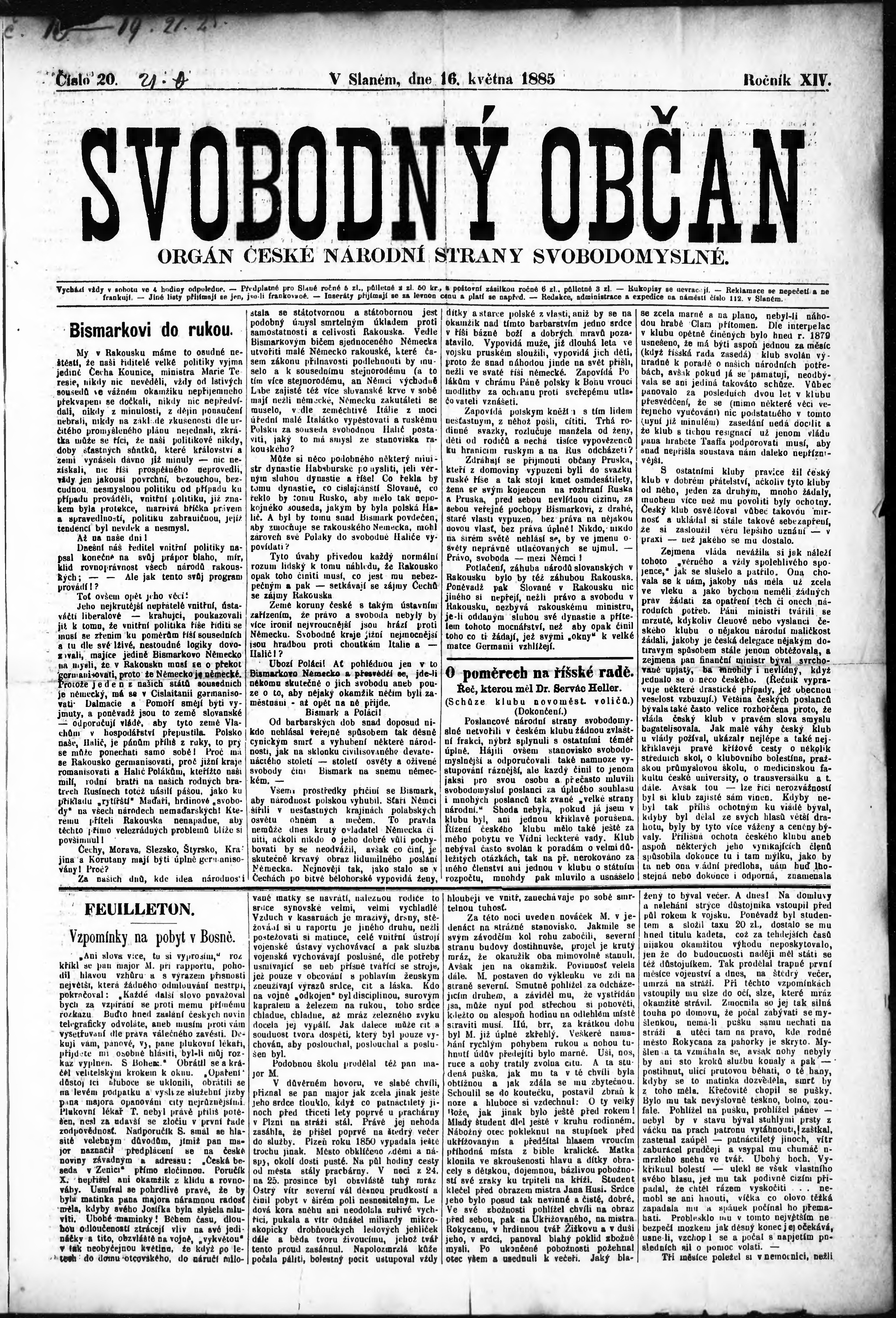 * Datum vydání výtisku: 16.5.1885 Číslo výtisku: 20