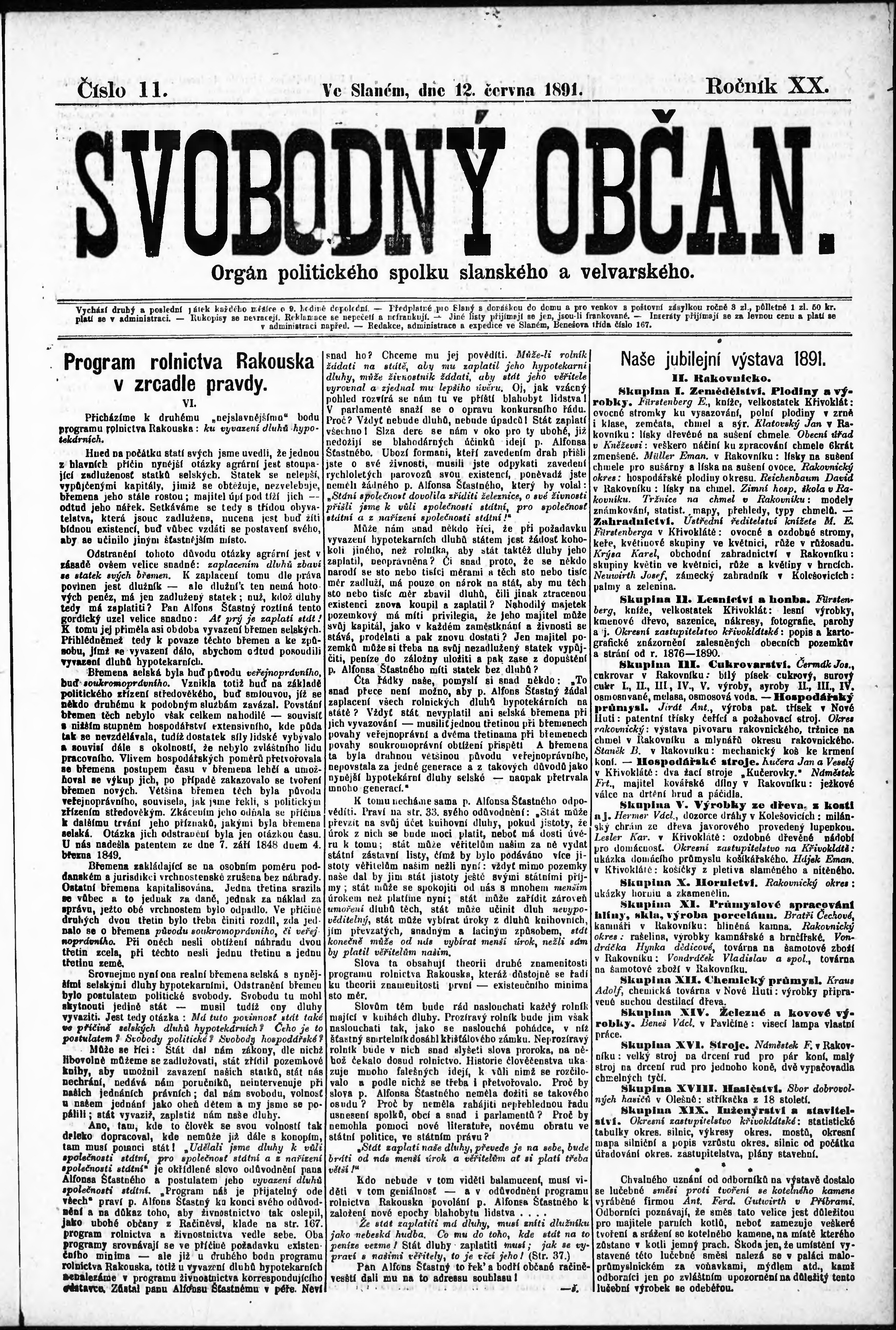 * Datum vydání výtisku: 12.6.1891 Číslo výtisku: 11