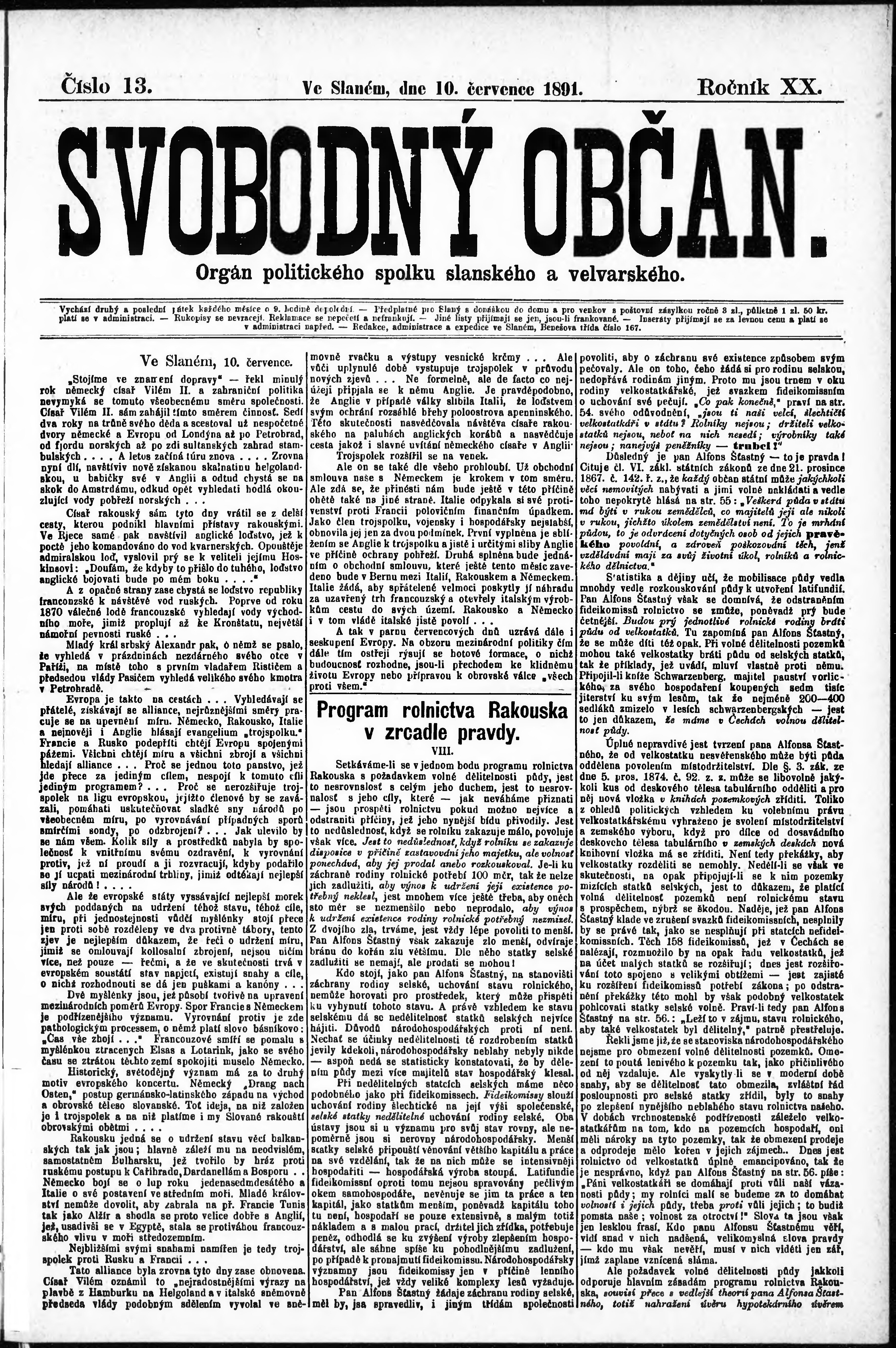 * Datum vydání výtisku: 10.7.1891 Číslo výtisku: 13