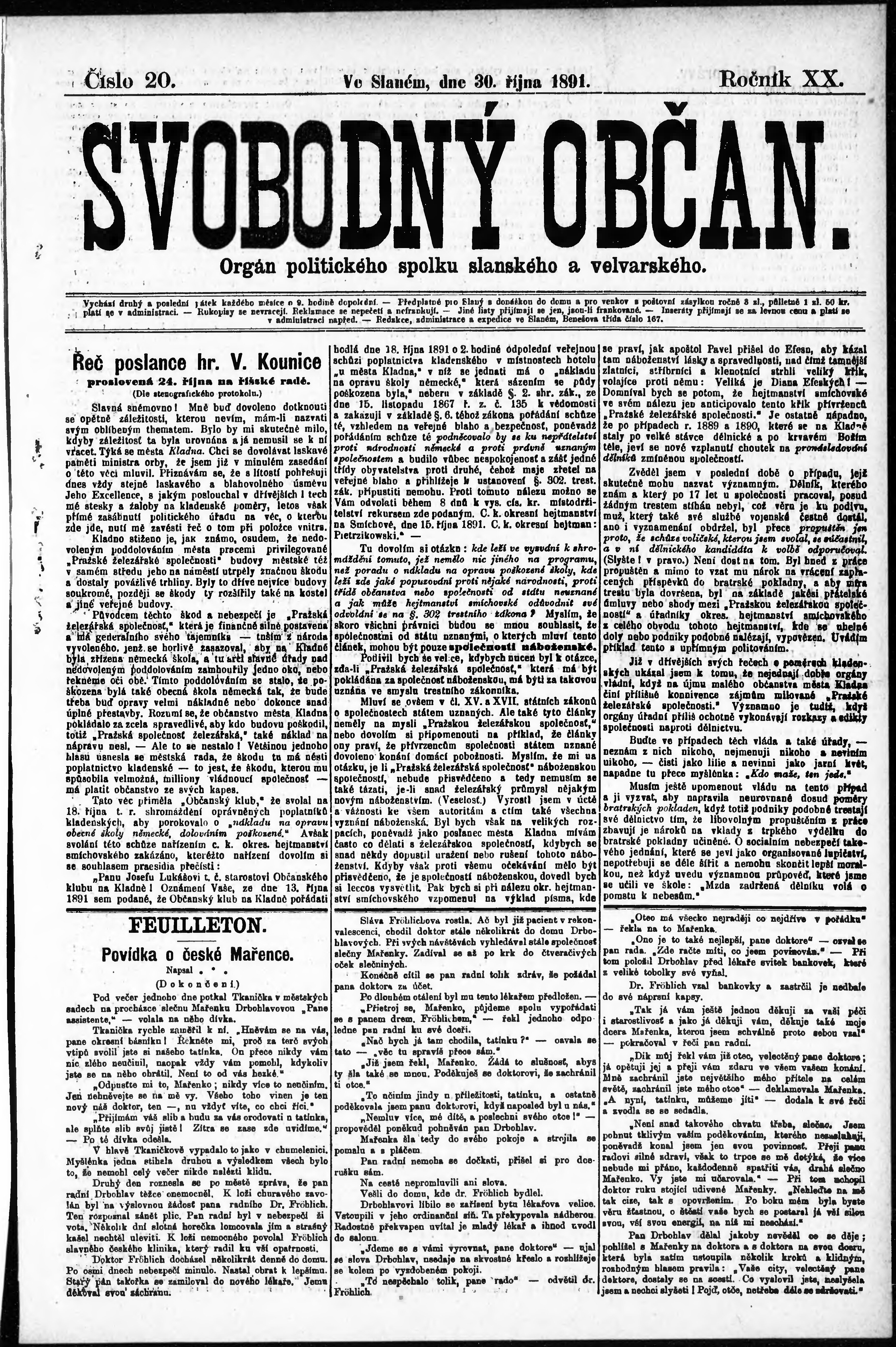 * Datum vydání výtisku: 30.10.1891 Číslo výtisku: 20