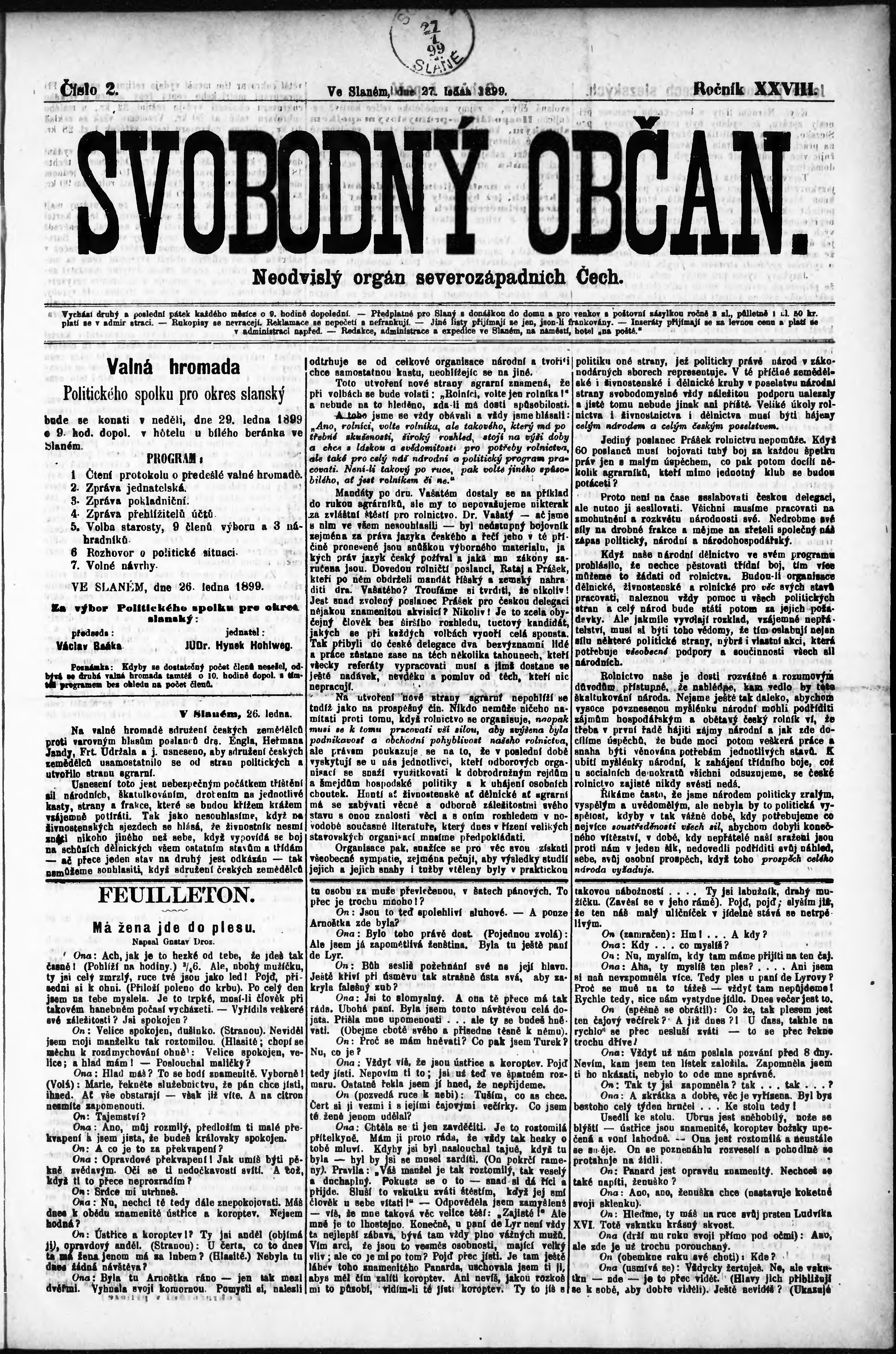 * Datum vydání výtisku: 27.1.1899 Číslo výtisku: 2