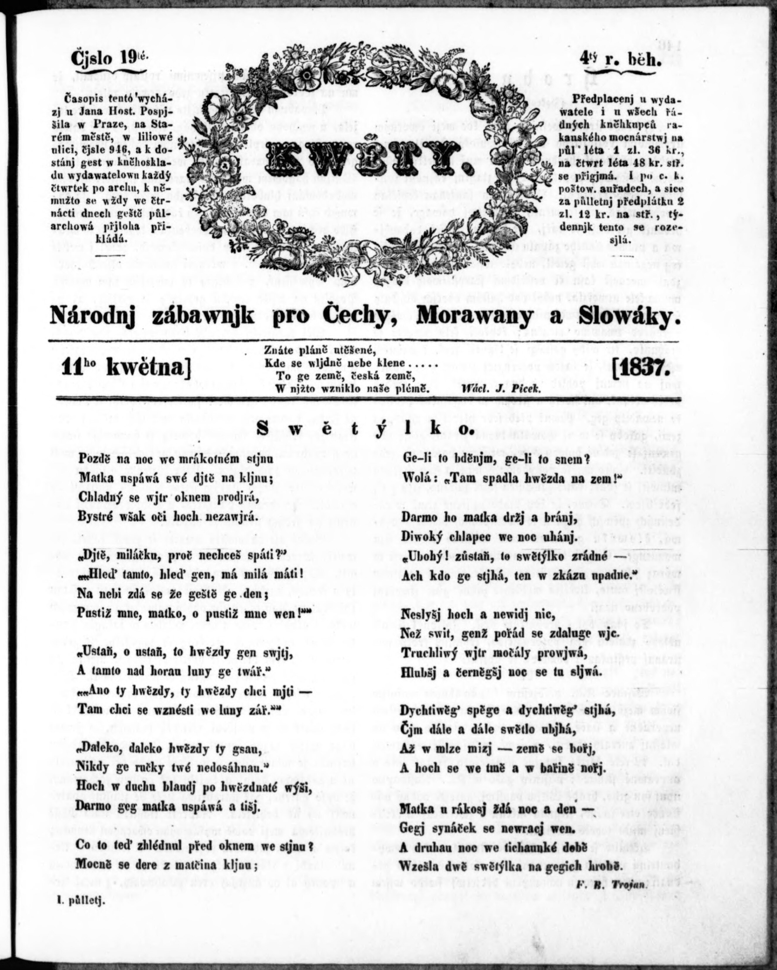 * Datum vydání výtisku: 11.5.1837 Číslo výtisku: 19