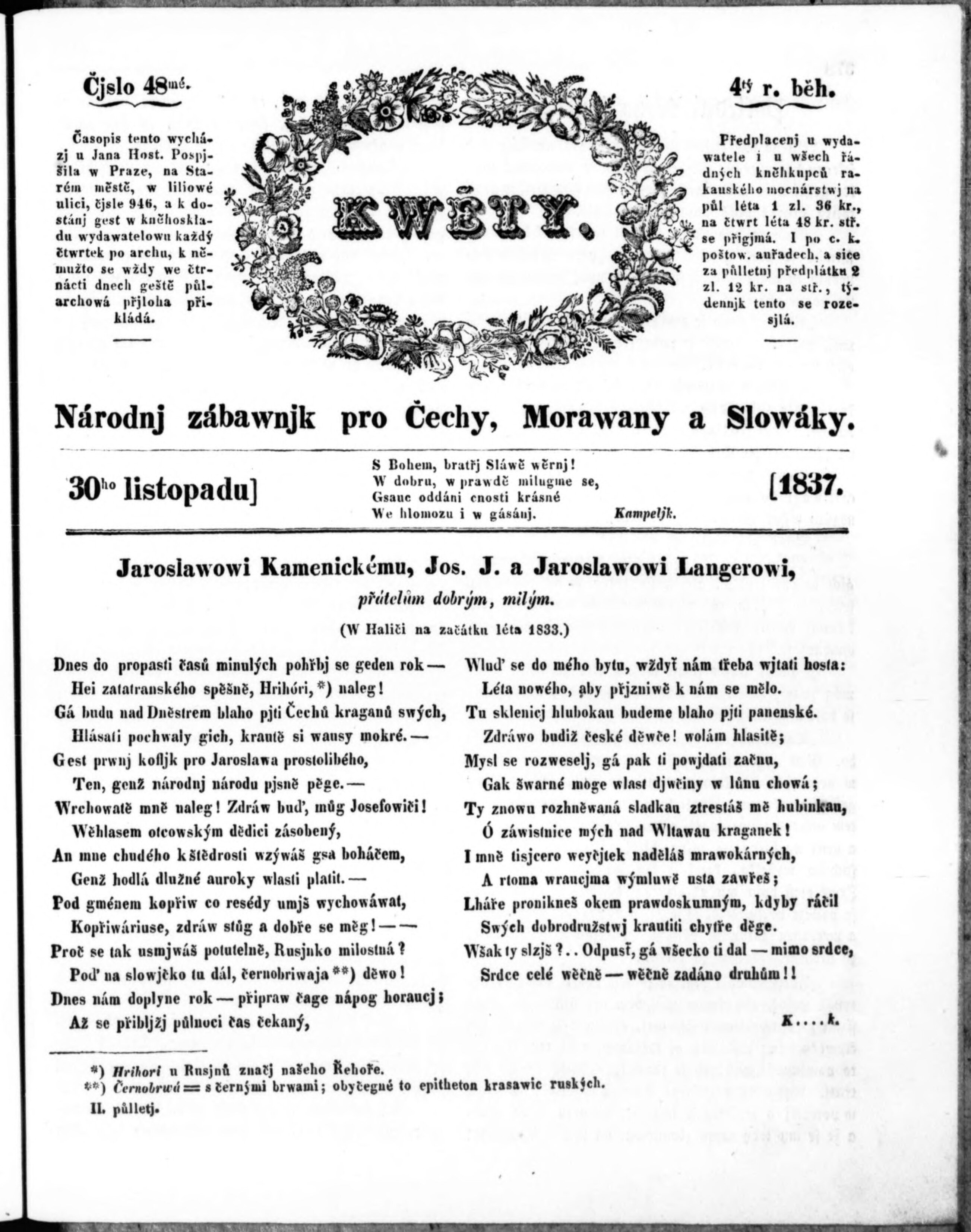 * Datum vydání výtisku: 30.11.1837 Číslo výtisku: 48