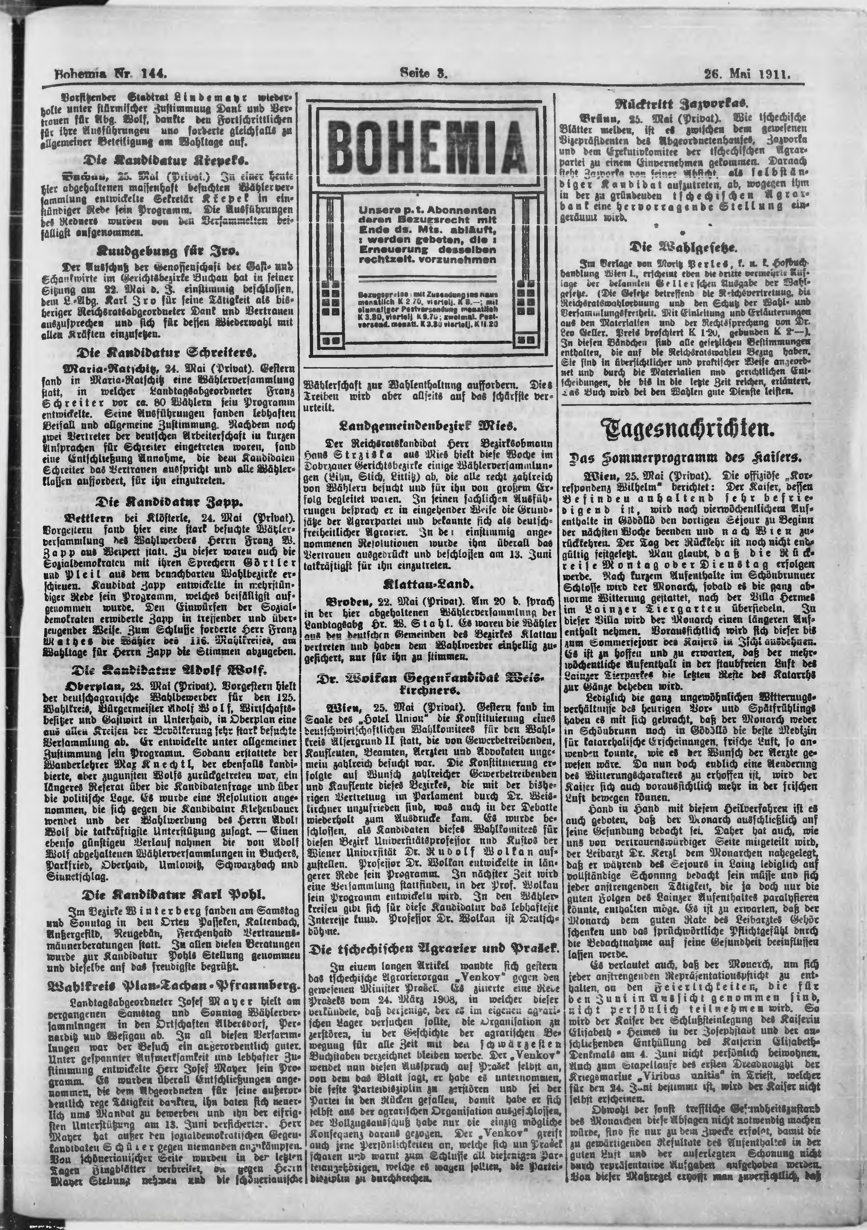 * Datum vydání výtisku: 26.5.1911 Číslo výtisku: 144 Poznámky k výtisku: ranní vydání