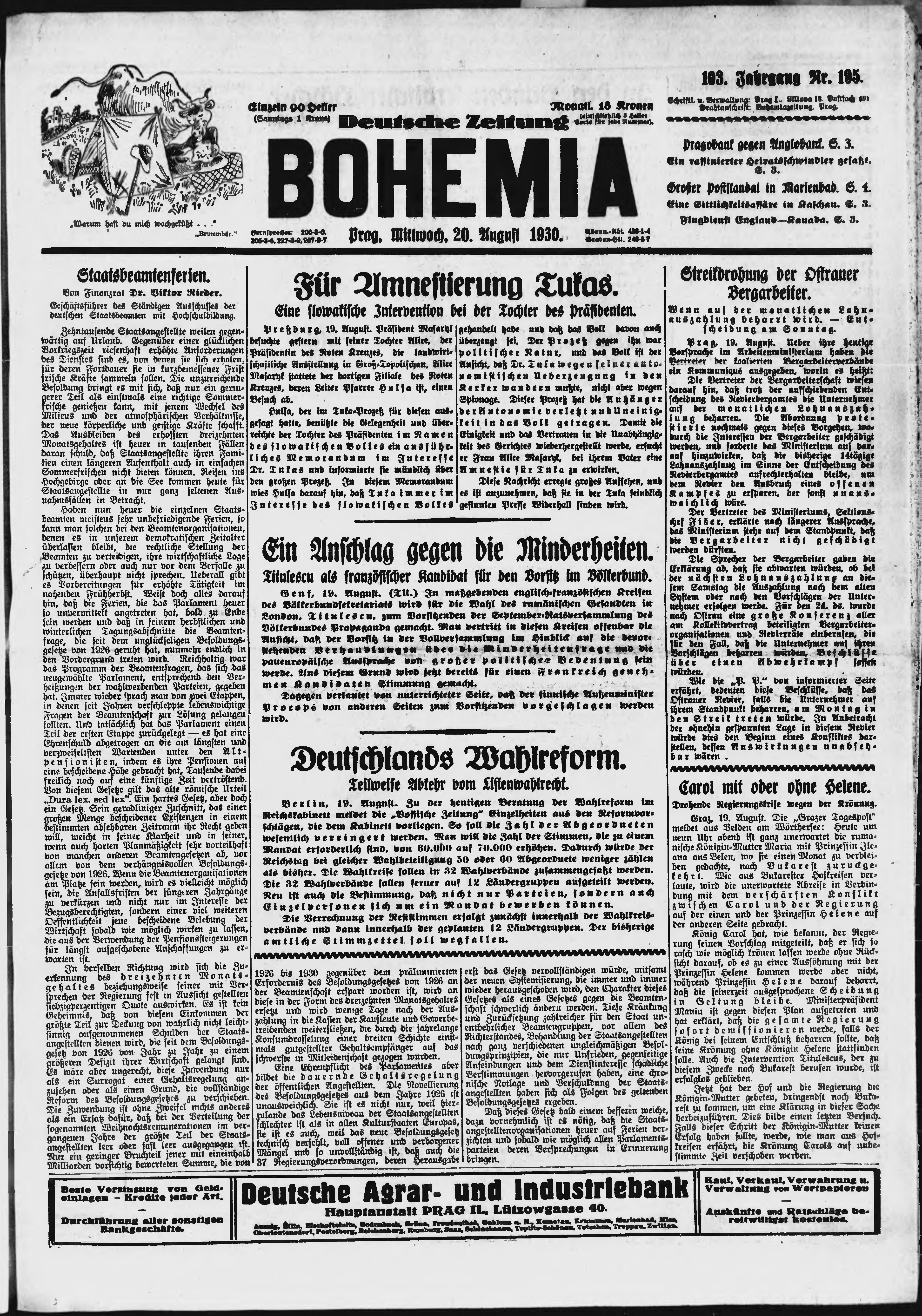 * Datum vydání výtisku: 20.8.1930 Číslo výtisku: 195 Poznámky k výtisku: ranní vydání;