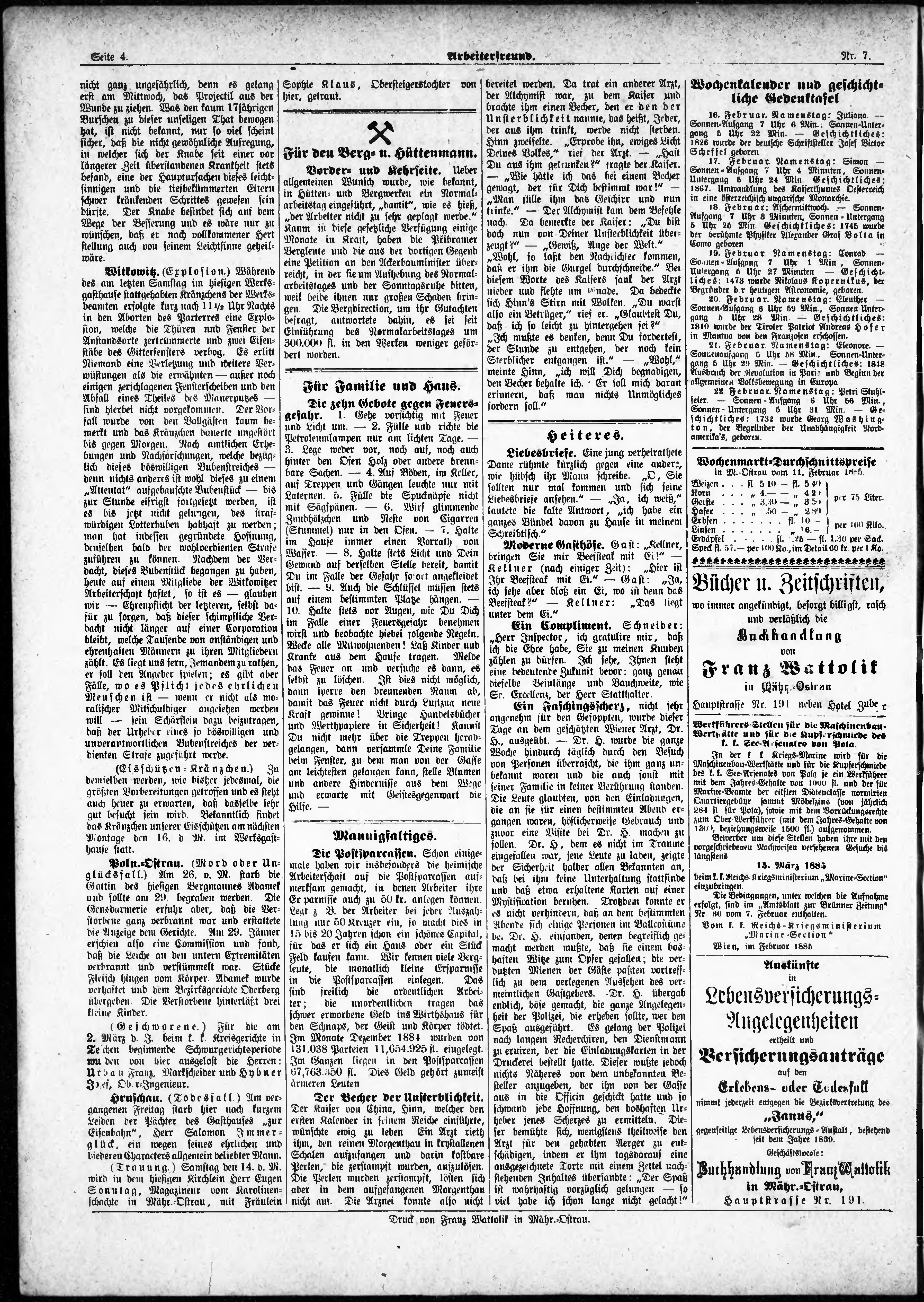 * Datum vydání výtisku: 15.2.1885 Číslo výtisku: 7