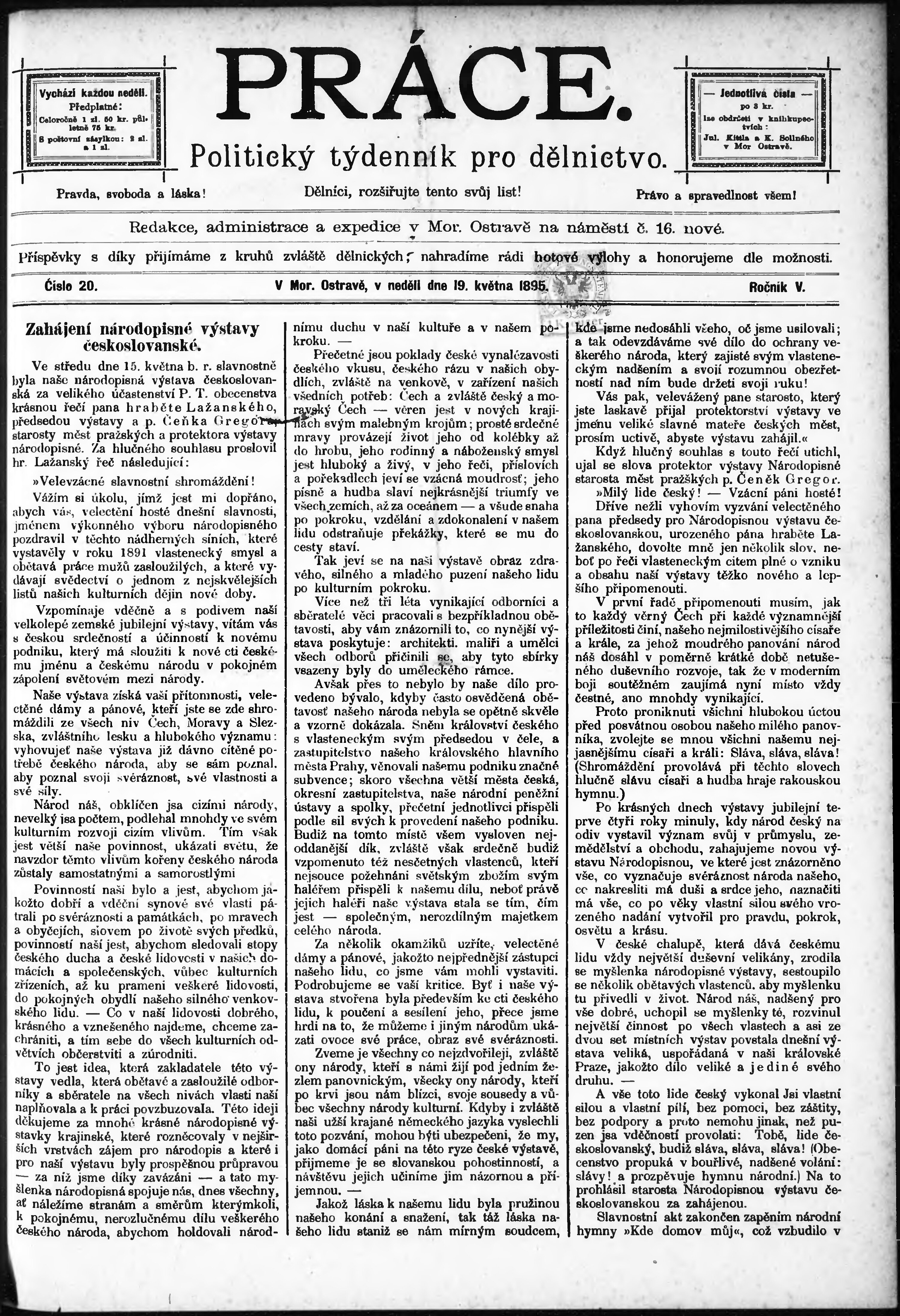 * Datum vydání výtisku: 19.5.1895 Číslo výtisku: 20