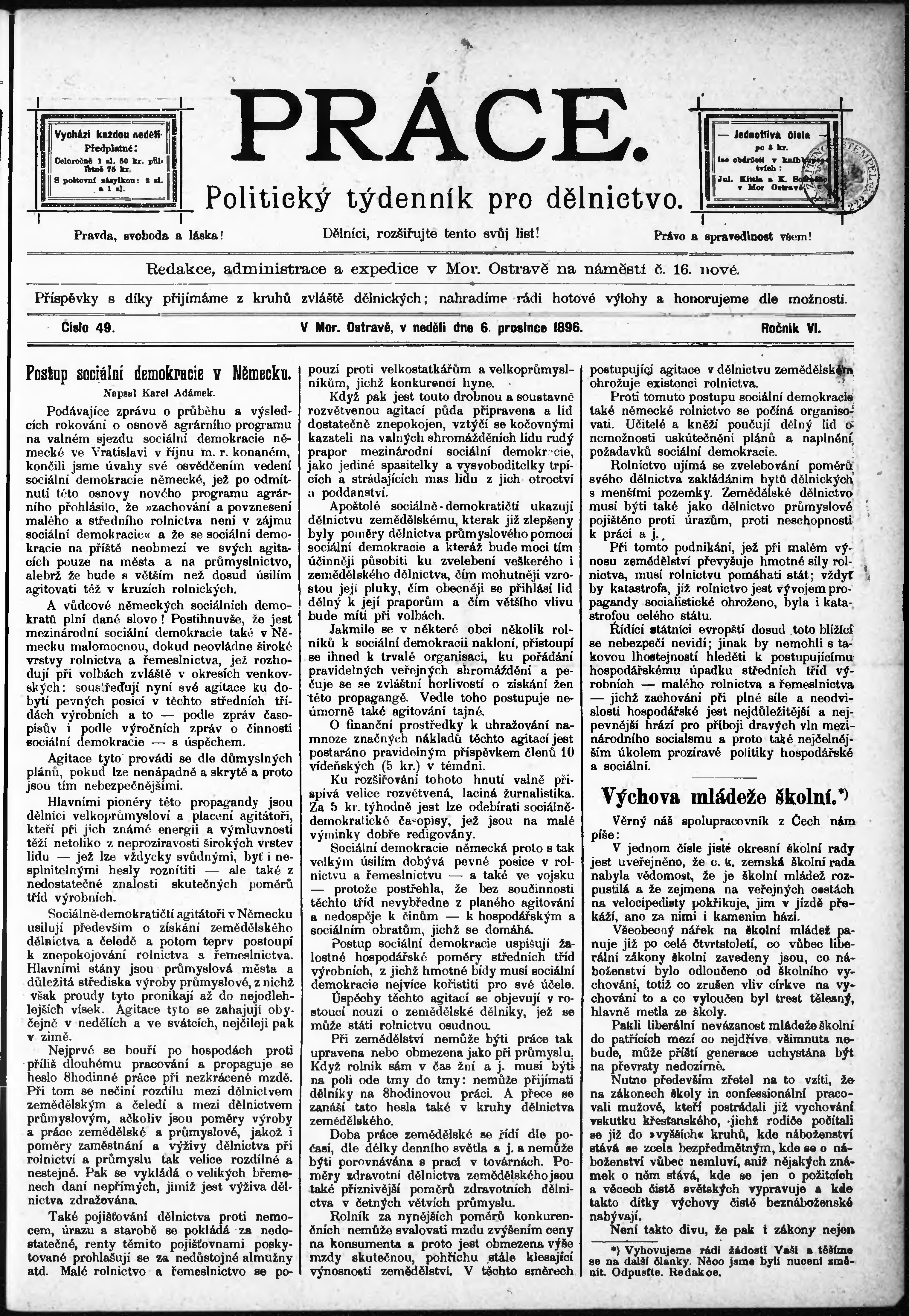 * Datum vydání výtisku: 6.12.1896 Číslo výtisku: 49