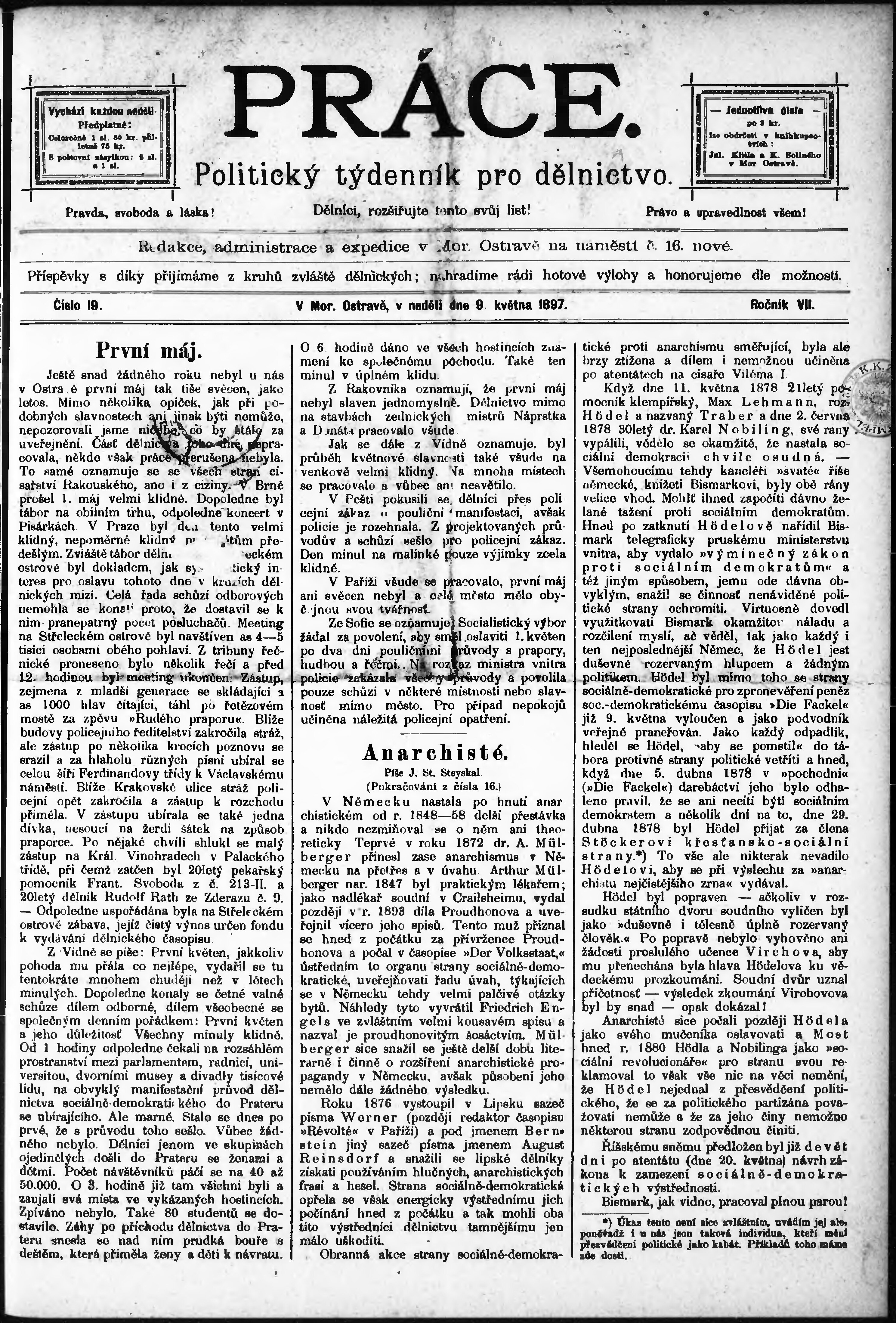 * Datum vydání výtisku: 9.5.1897 Číslo výtisku: 19