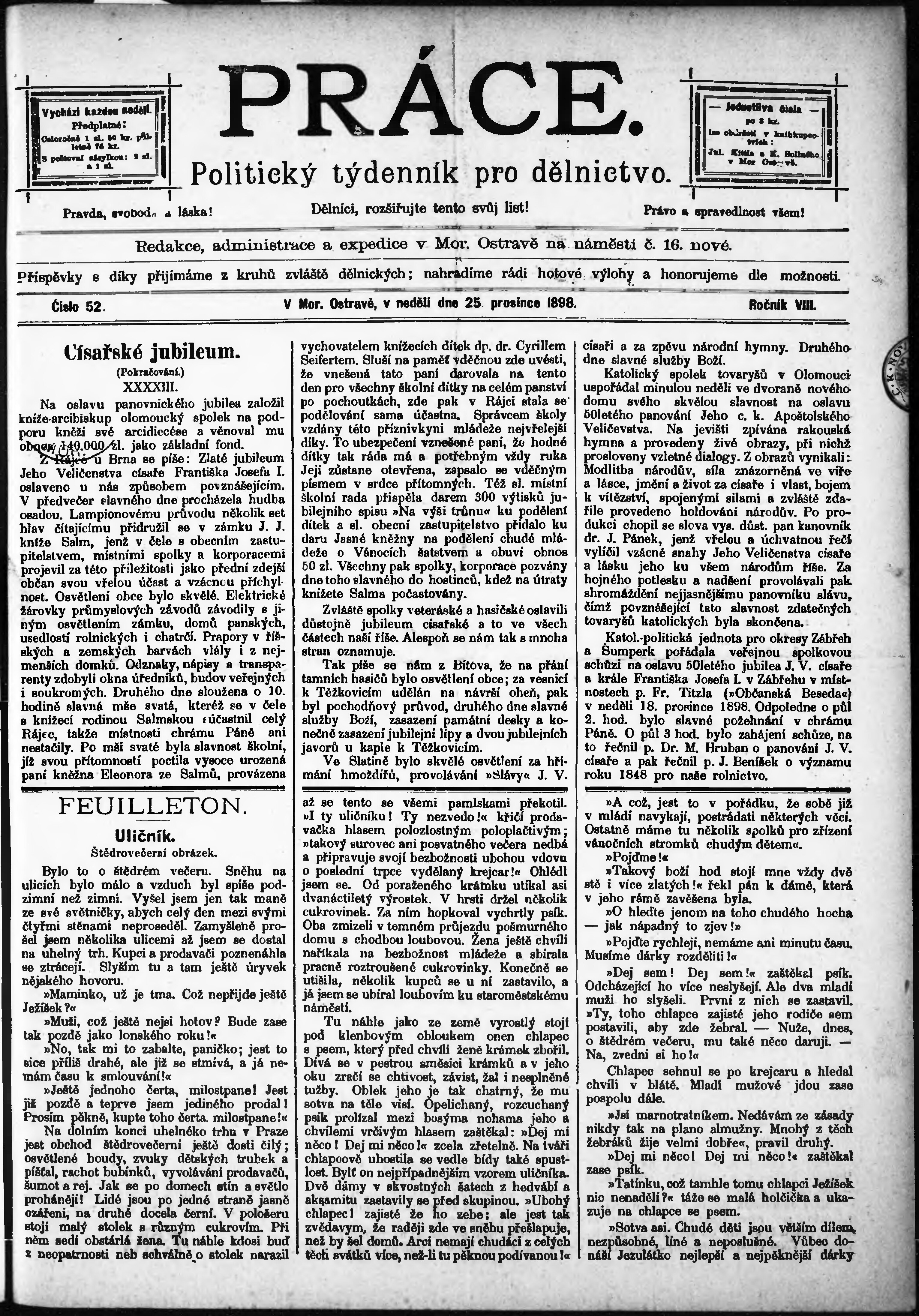 * Datum vydání výtisku: 25.12.1898 Číslo výtisku: 52
