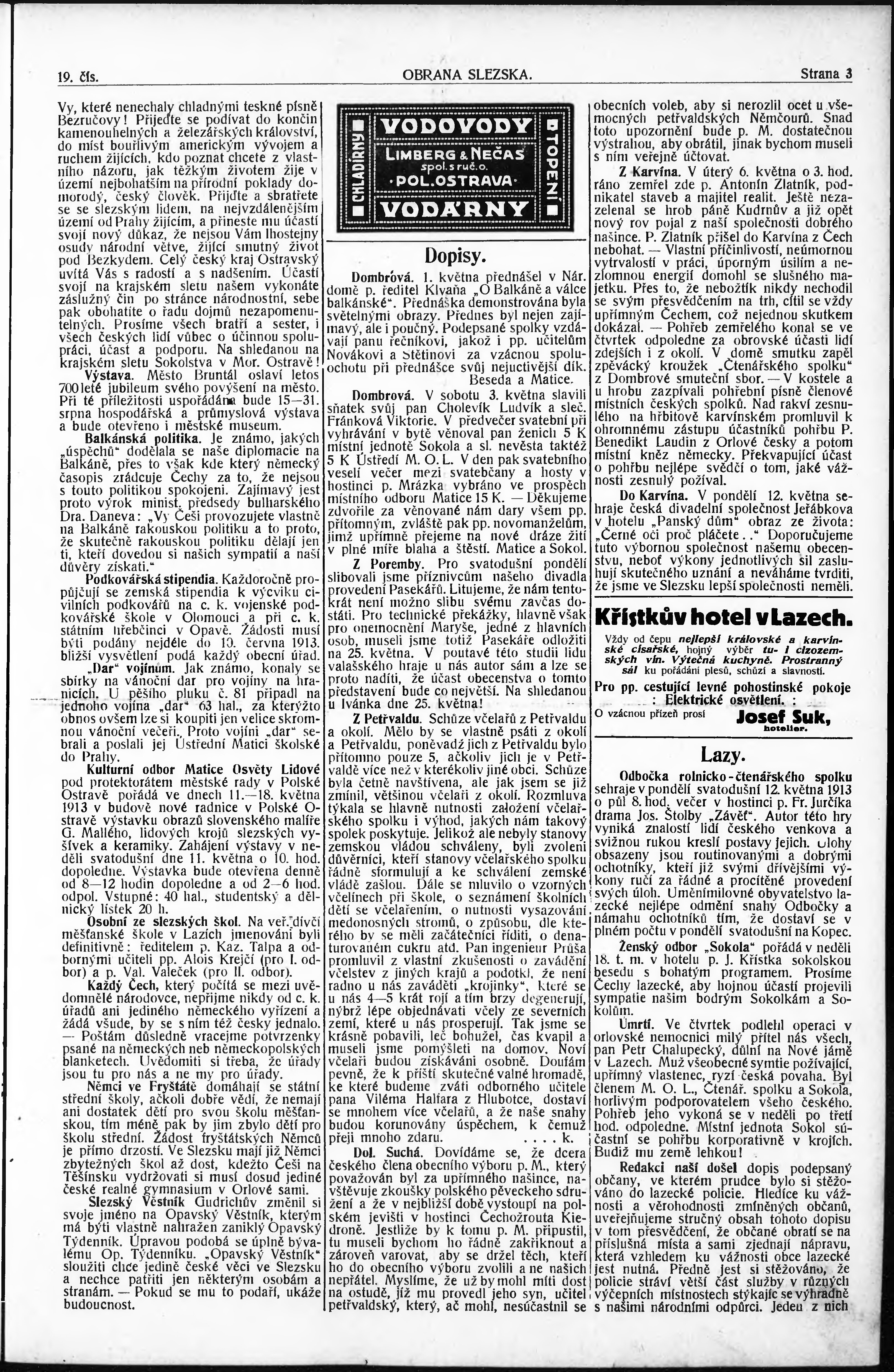 * Datum vydání výtisku: 9.5.1913 Číslo výtisku: 19