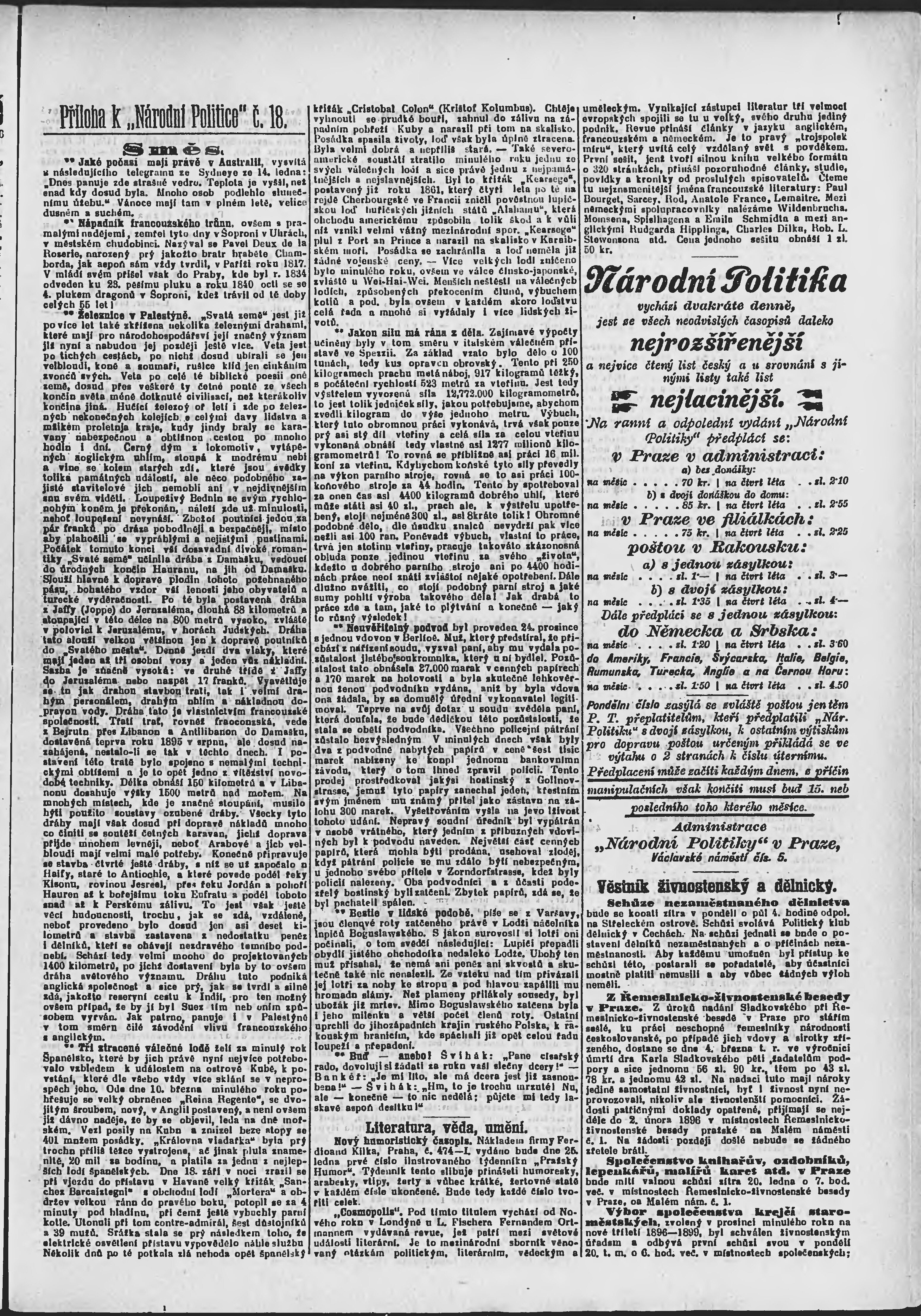 * Datum vydání výtisku: 19.1.1896 Číslo výtisku: 18 Poznámky k výtisku: ranní vydání;