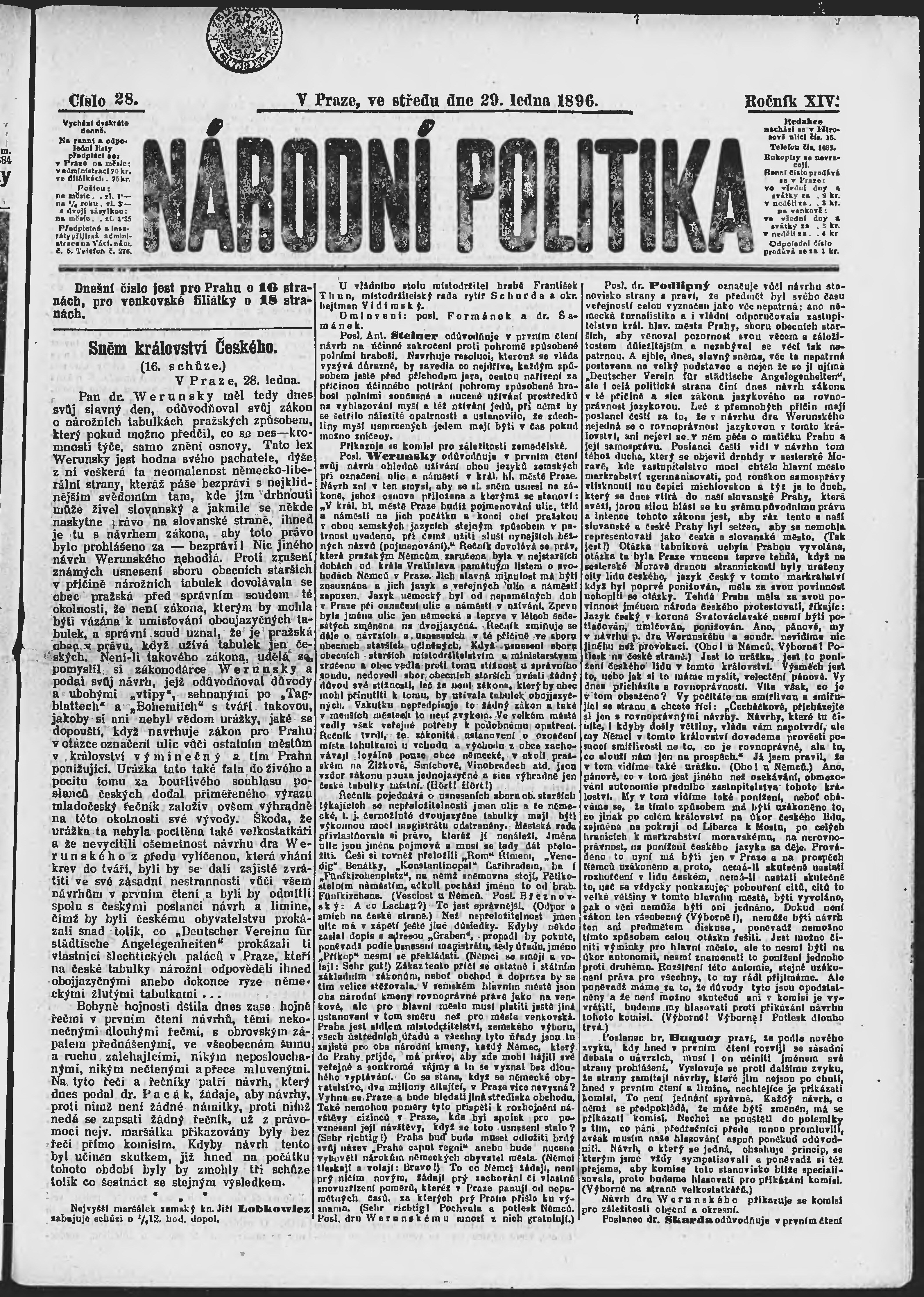 * Datum vydání výtisku: 29.1.1896 Číslo výtisku: 28 Poznámky k výtisku: ranní vydání;