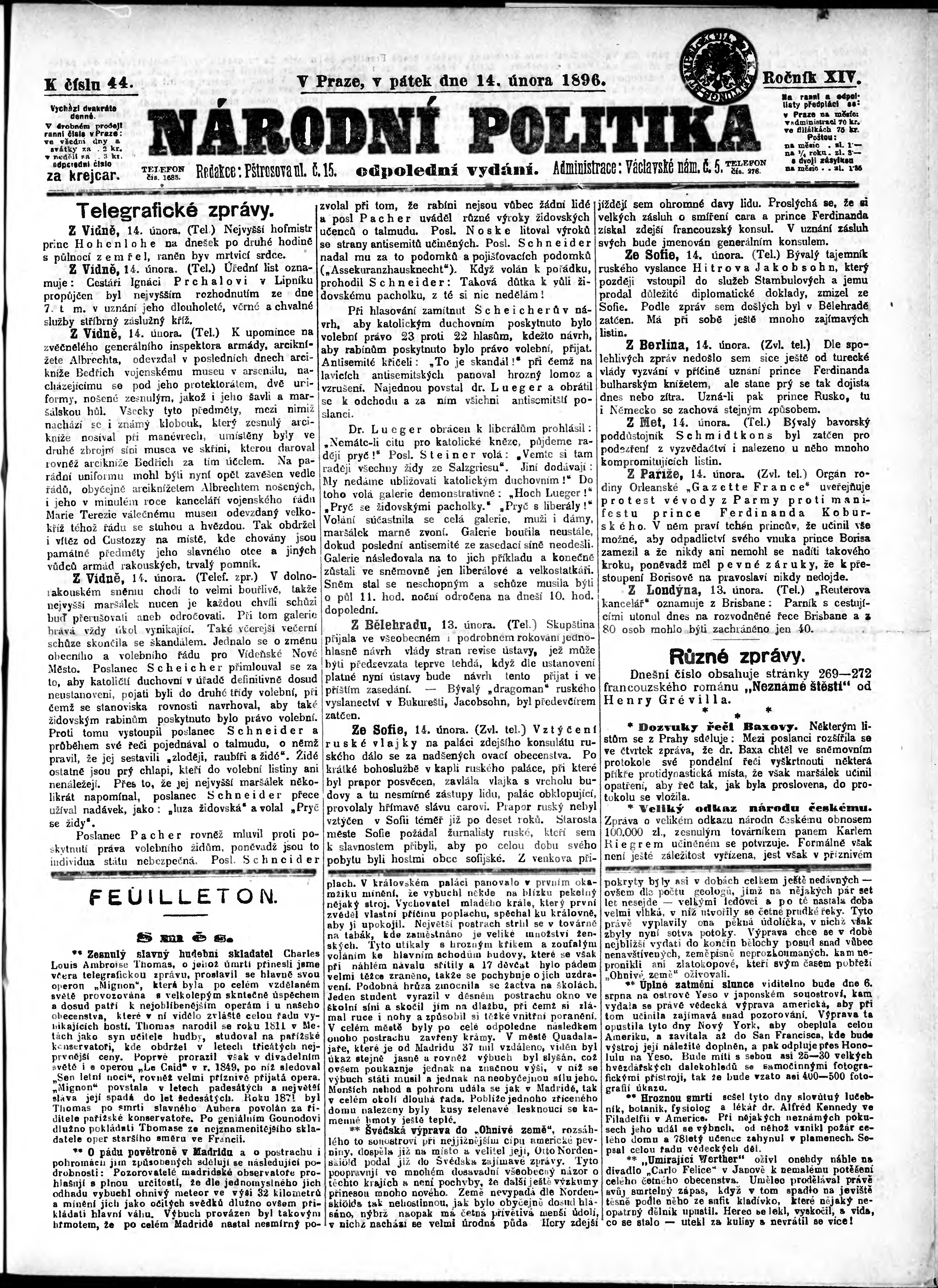 * Datum vydání výtisku: 14.2.1896 Číslo výtisku: 44 Poznámky k výtisku: odpolední vydání;