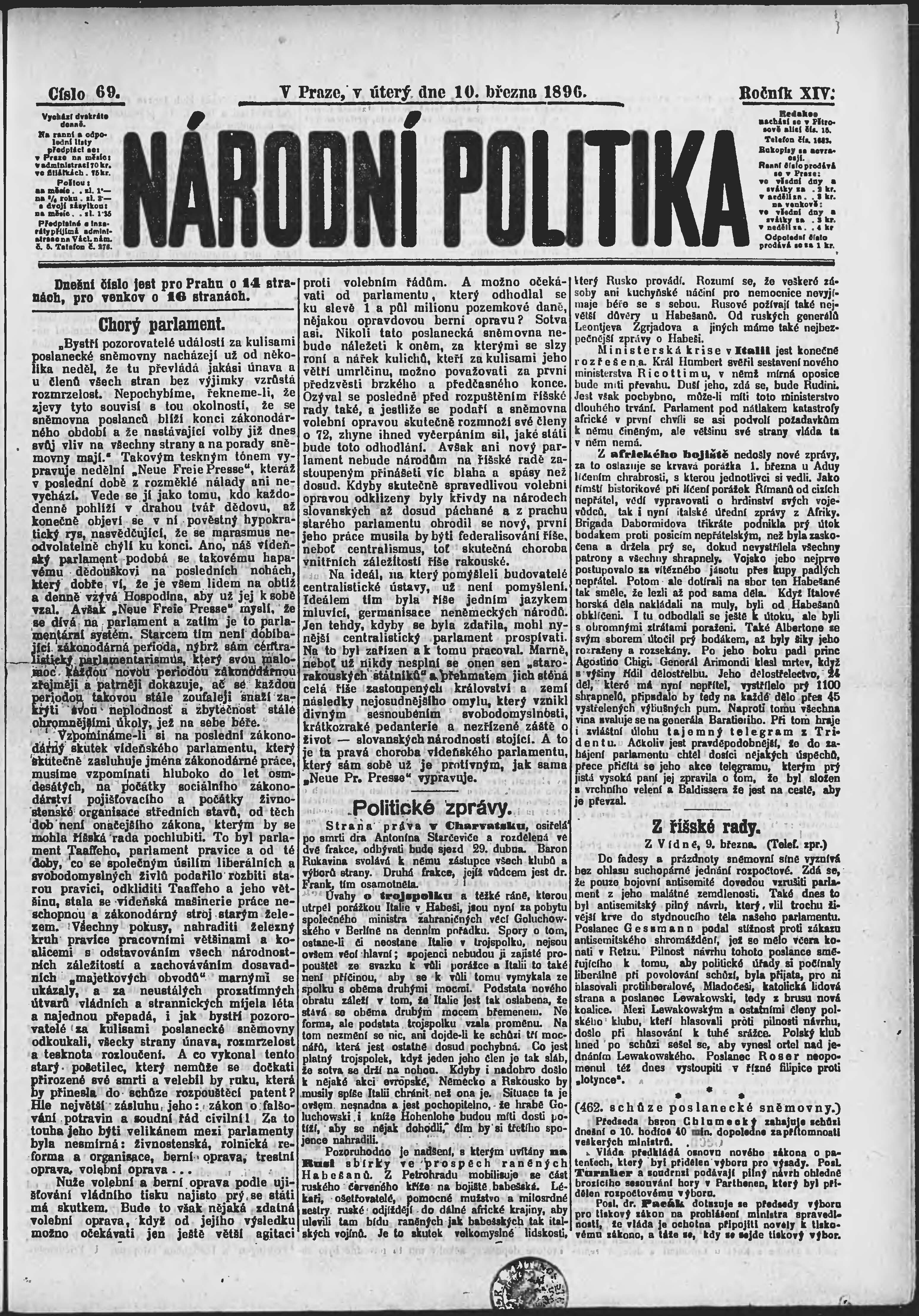 * Datum vydání výtisku: 10.3.1896 Číslo výtisku: 69 Poznámky k výtisku: ranní vydání;