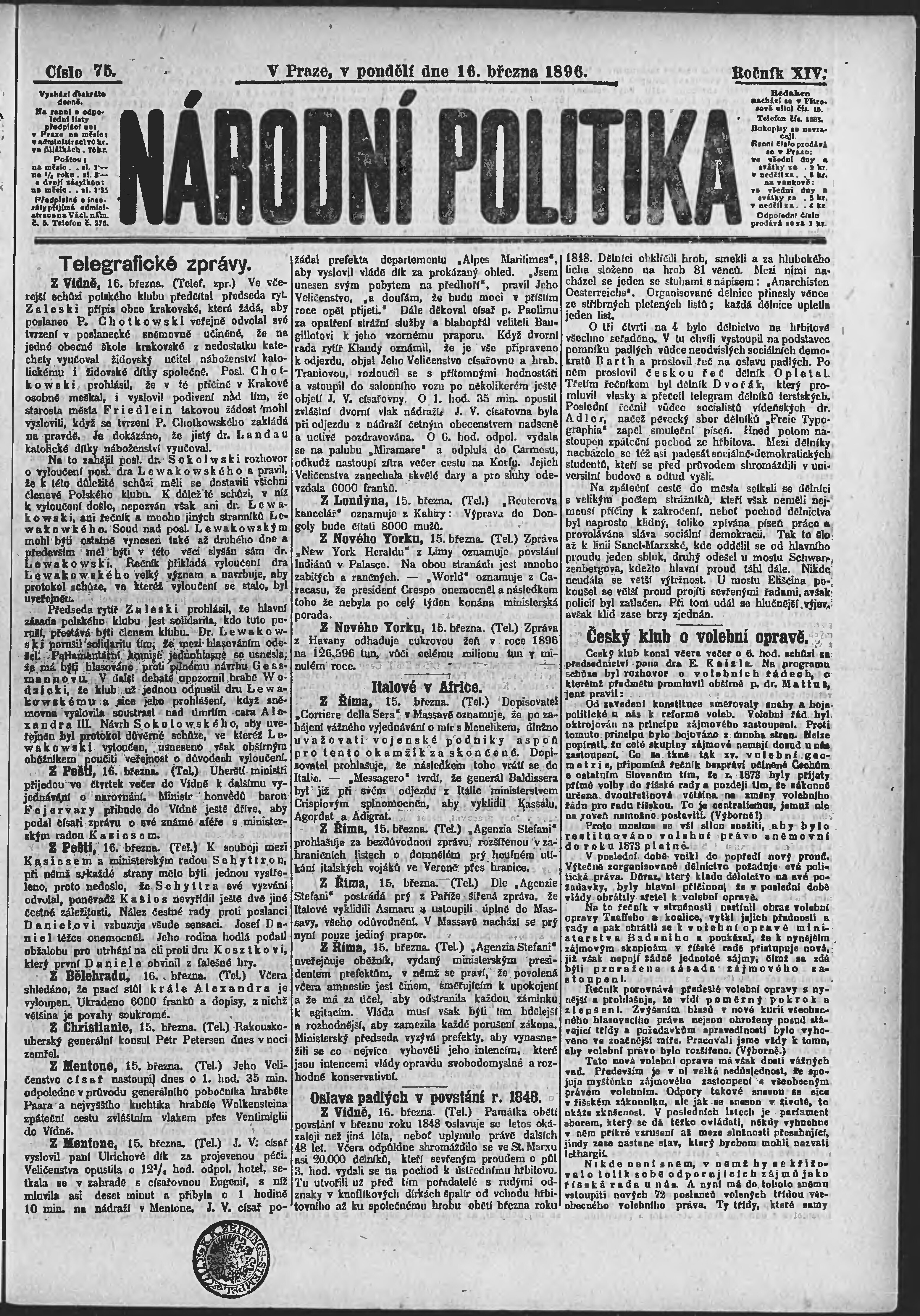 * Datum vydání výtisku: 16.3.1896 Číslo výtisku: 75 Poznámky k výtisku: ranní vydání;