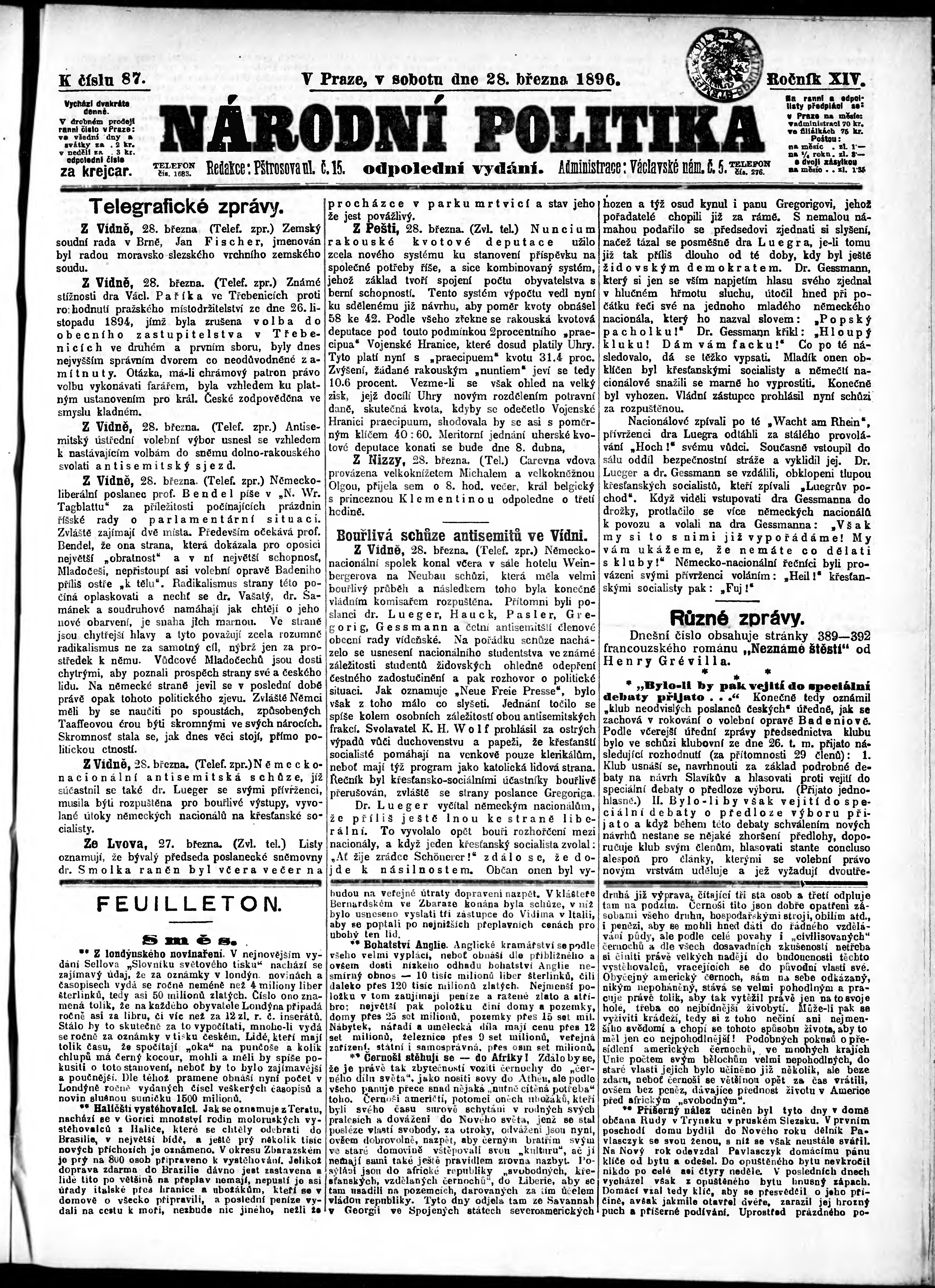 * Datum vydání výtisku: 28.3.1896 Číslo výtisku: 87 Poznámky k výtisku: odpolední vydání;