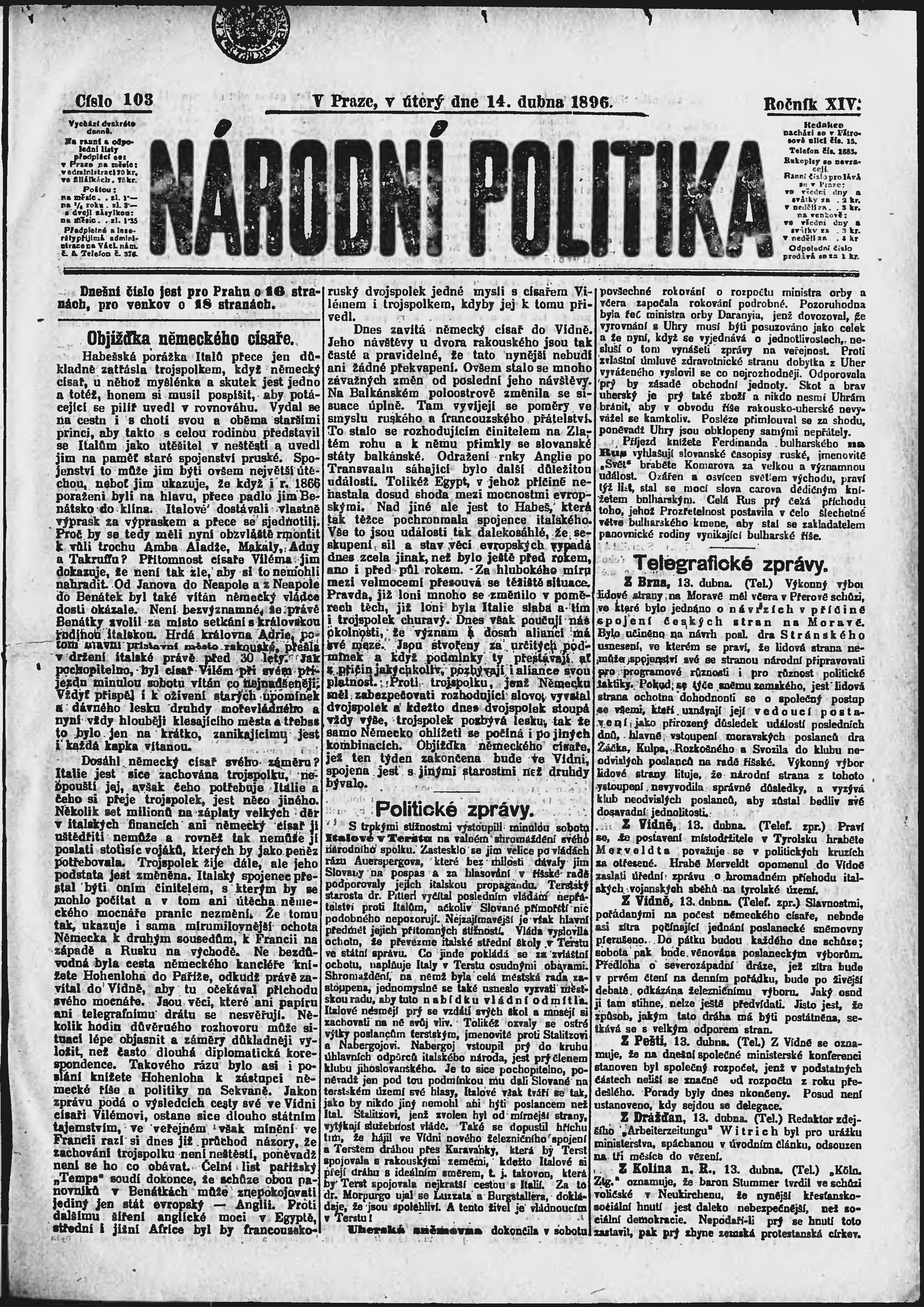 * Datum vydání výtisku: 14.4.1896 Číslo výtisku: 103 Poznámky k výtisku: ranní vydání;