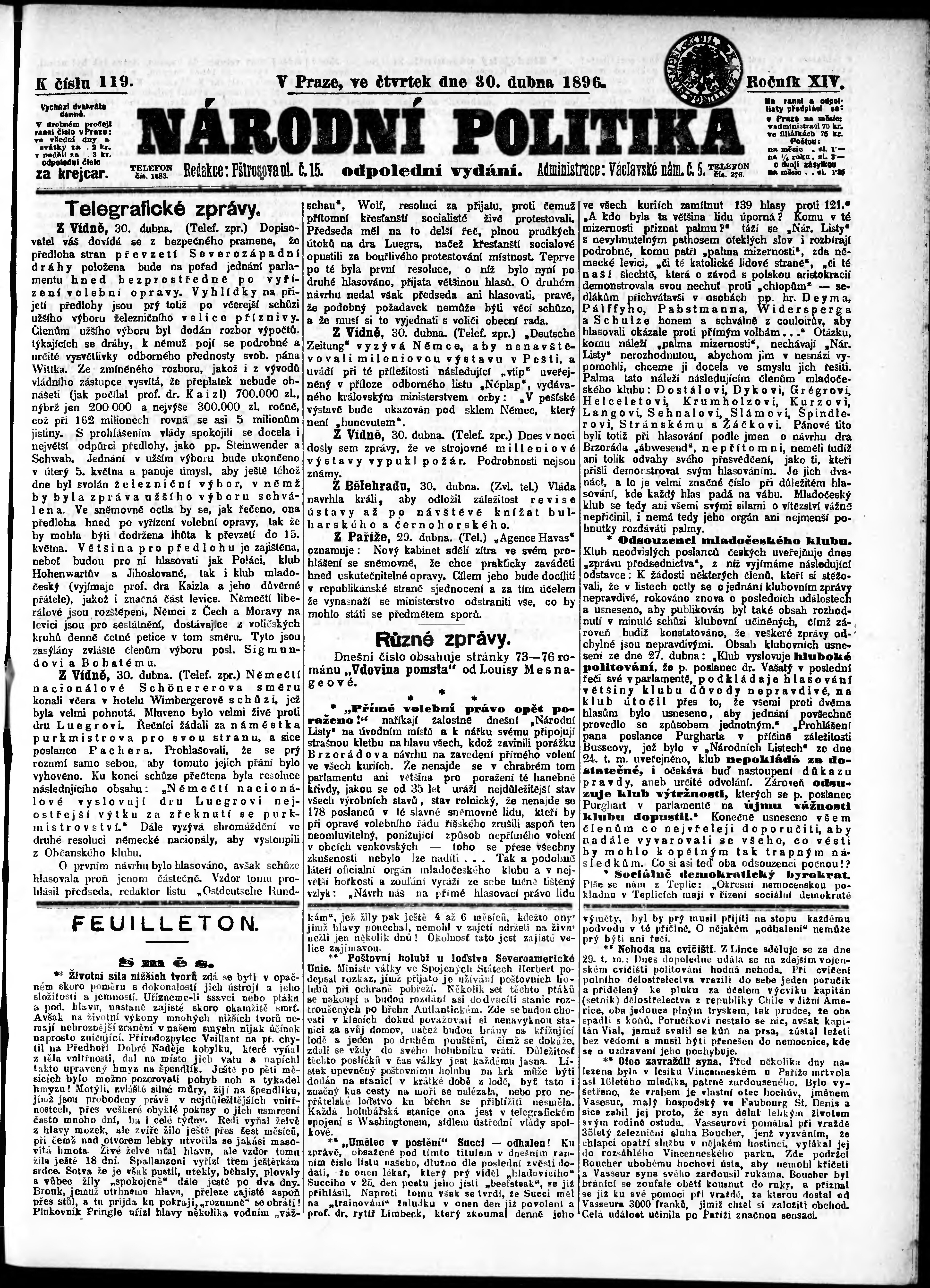 * Datum vydání výtisku: 30.4.1896 Číslo výtisku: 119 Poznámky k výtisku: odpolední vydání;