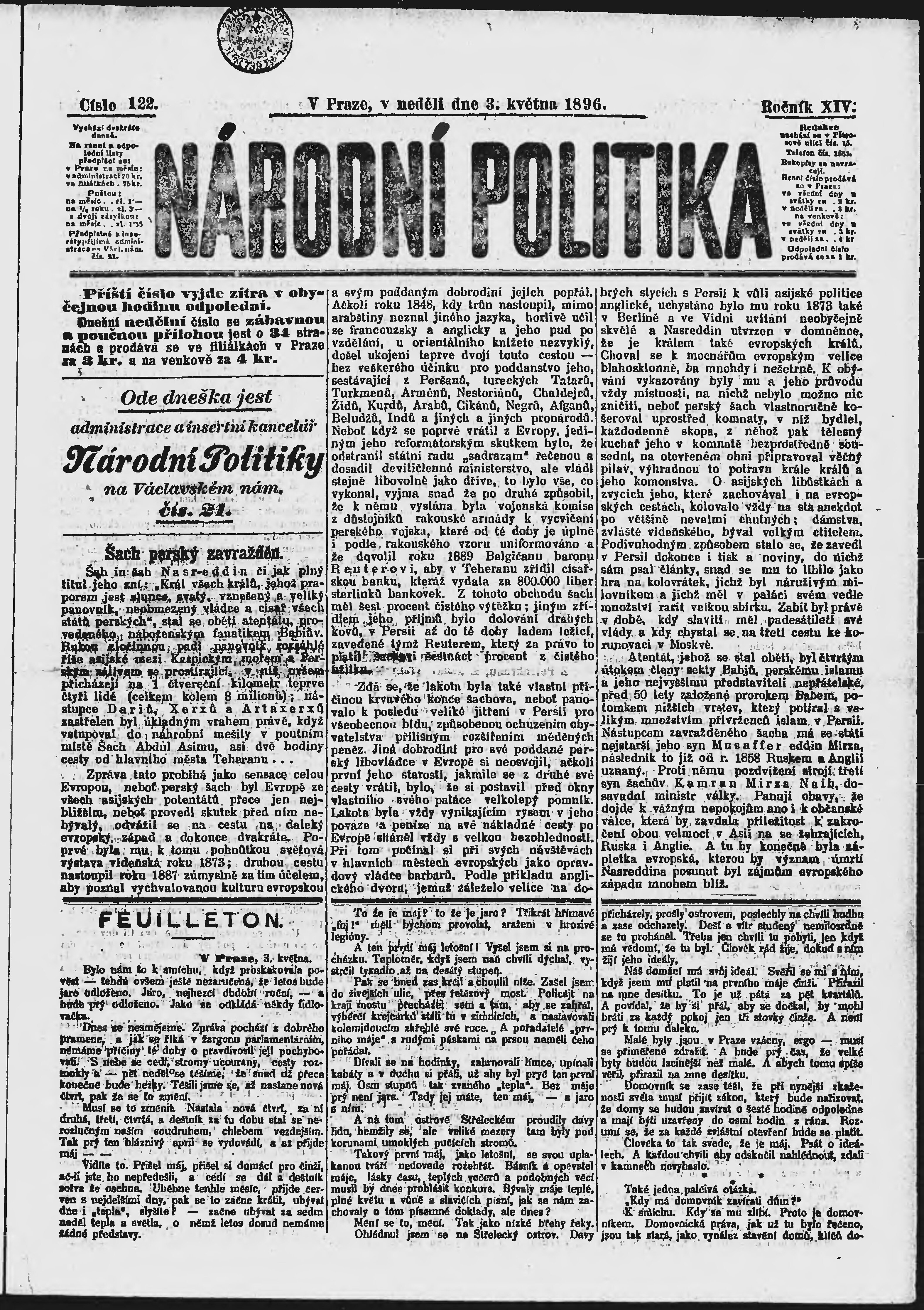 * Datum vydání výtisku: 3.5.1896 Číslo výtisku: 122 Poznámky k výtisku: ranní vydání;