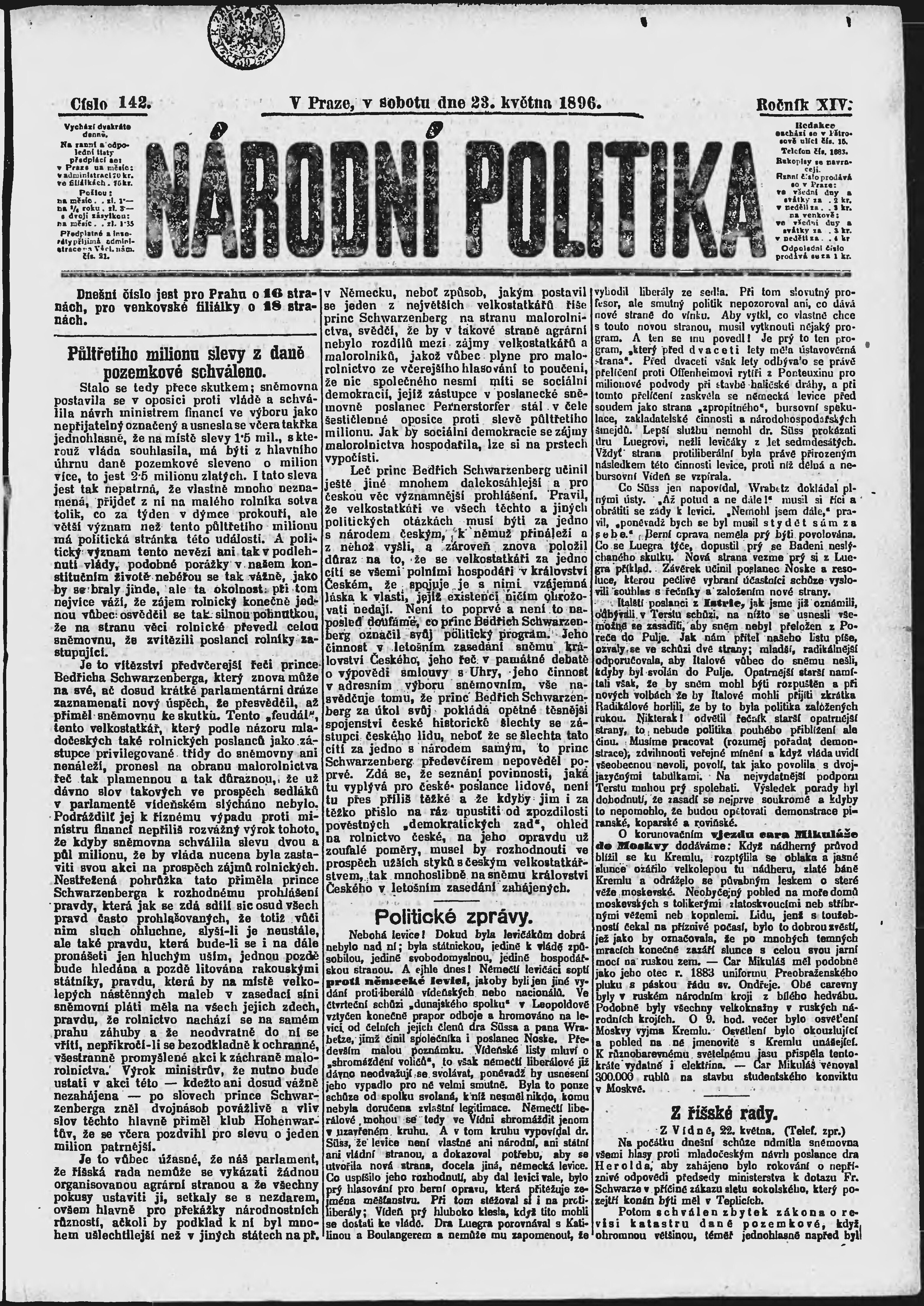 * Datum vydání výtisku: 23.5.1896 Číslo výtisku: 142 Poznámky k výtisku: ranní vydání;