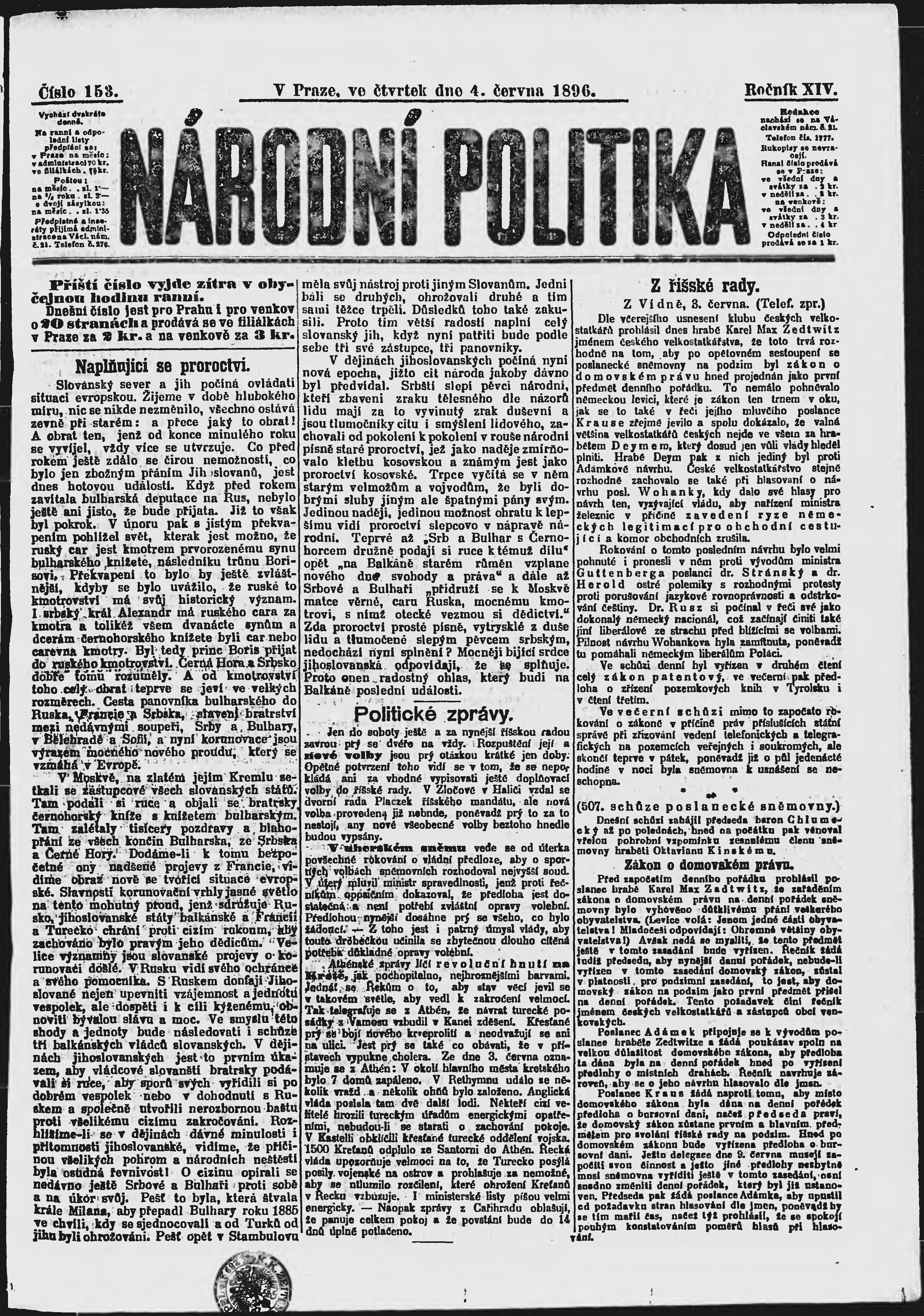 * Datum vydání výtisku: 4.6.1896 Číslo výtisku: 153 Poznámky k výtisku: ranní vydání;
