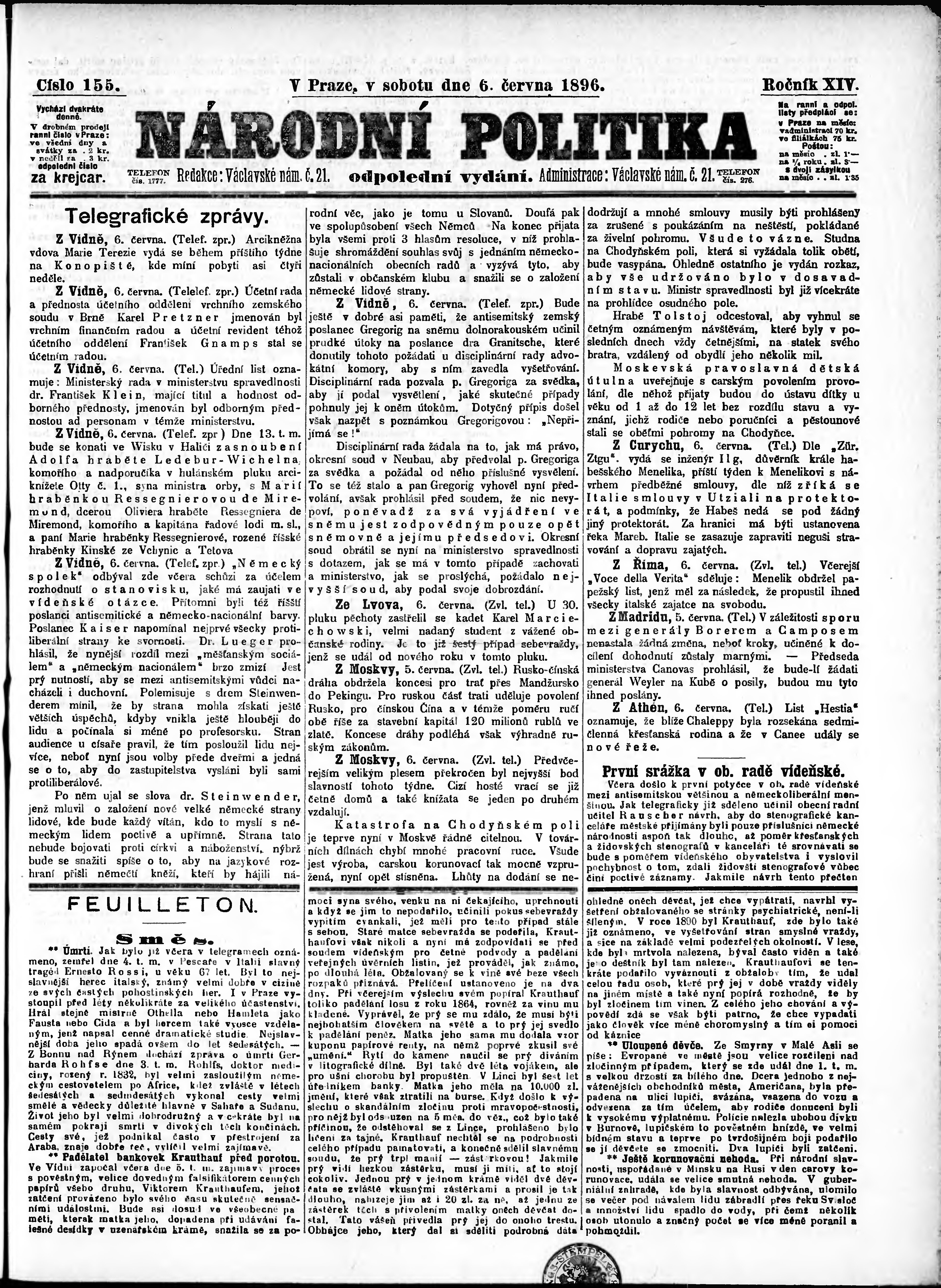 * Datum vydání výtisku: 6.6.1896 Číslo výtisku: 155 Poznámky k výtisku: odpolední vydání;
