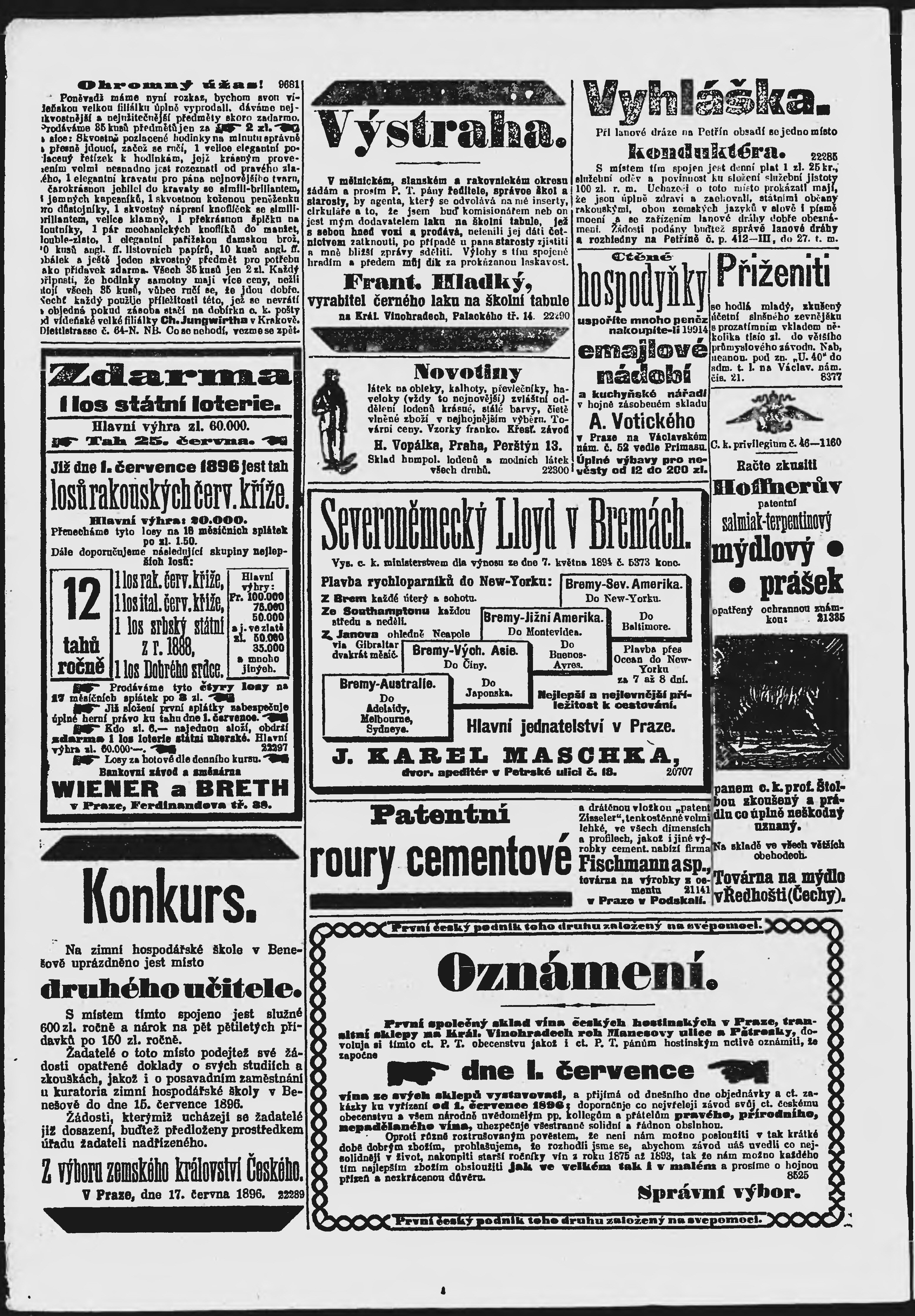 * Datum vydání výtisku: 23.6.1896 Číslo výtisku: 172 Poznámky k výtisku: ranní vydání;