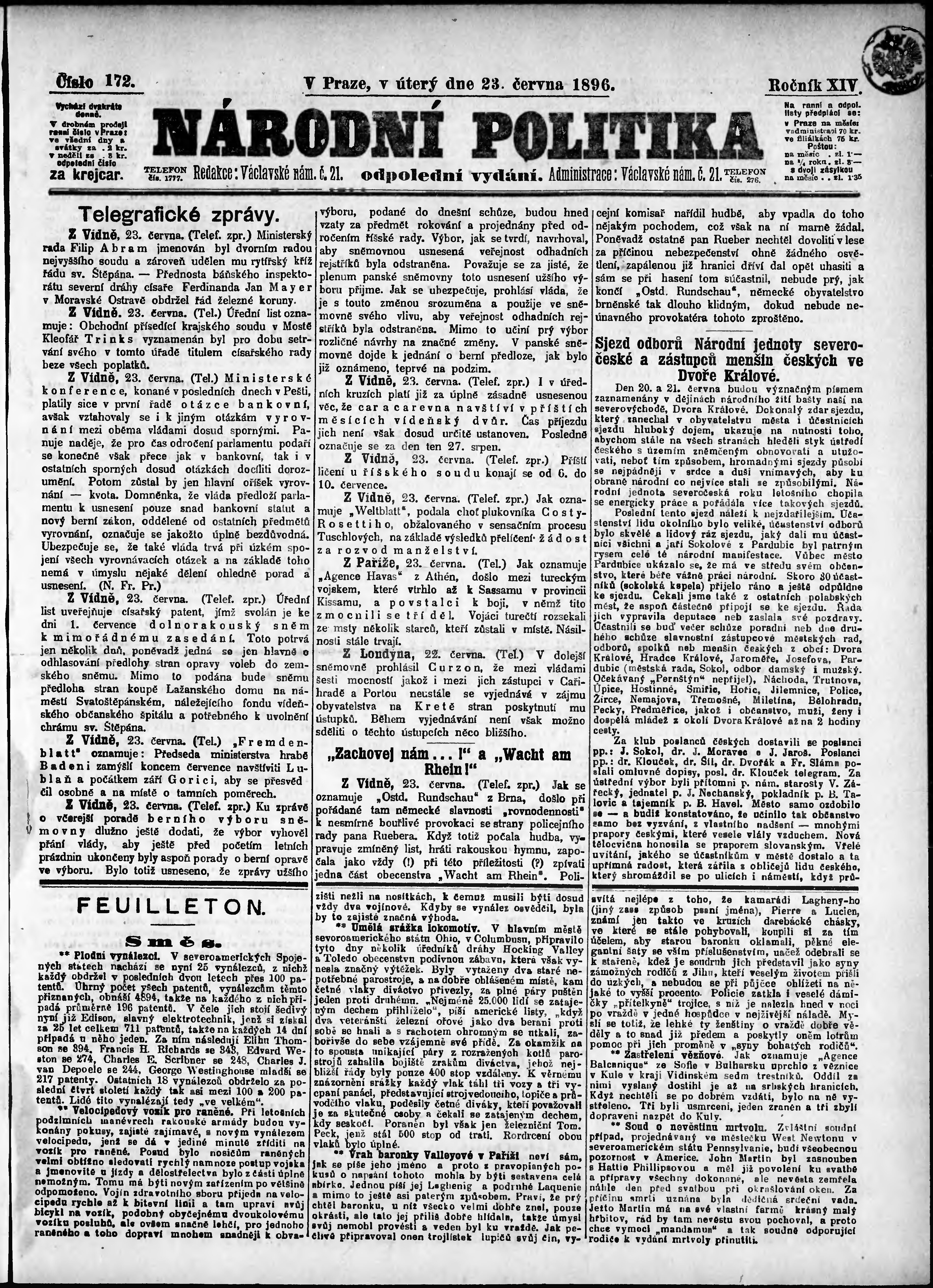 * Datum vydání výtisku: 23.6.1896 Číslo výtisku: 172 Poznámky k výtisku: odpolední vydání;